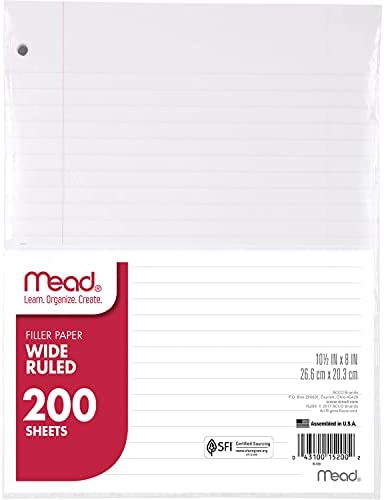 Mead Filler Paper is very durable and will hold up well during the school year and beyond. Mead Filler Paper is three hole-punched for easy placement in a standard binder or pocket & prong folder. It is wide ruled for clear note taking and comes with 200 sheets.