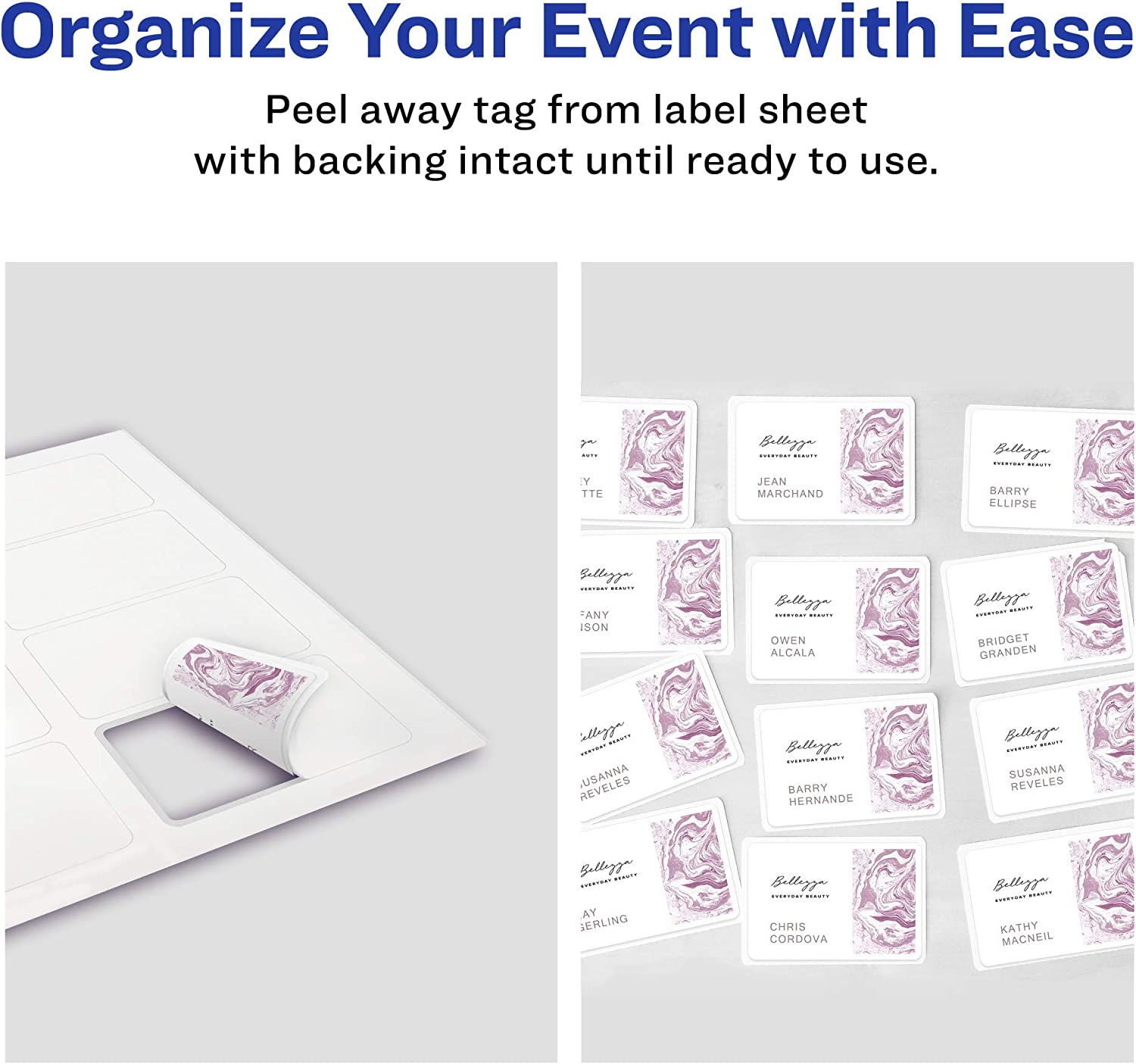 • Save time before your event with the unique peel-away design that allows you to separate each name badge from the printed sheet with the label backing still intact until ready to use