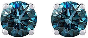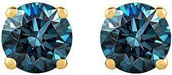 Blue - I1 Round Brilliant Cut Diamond Earring Studs in 14K Gold