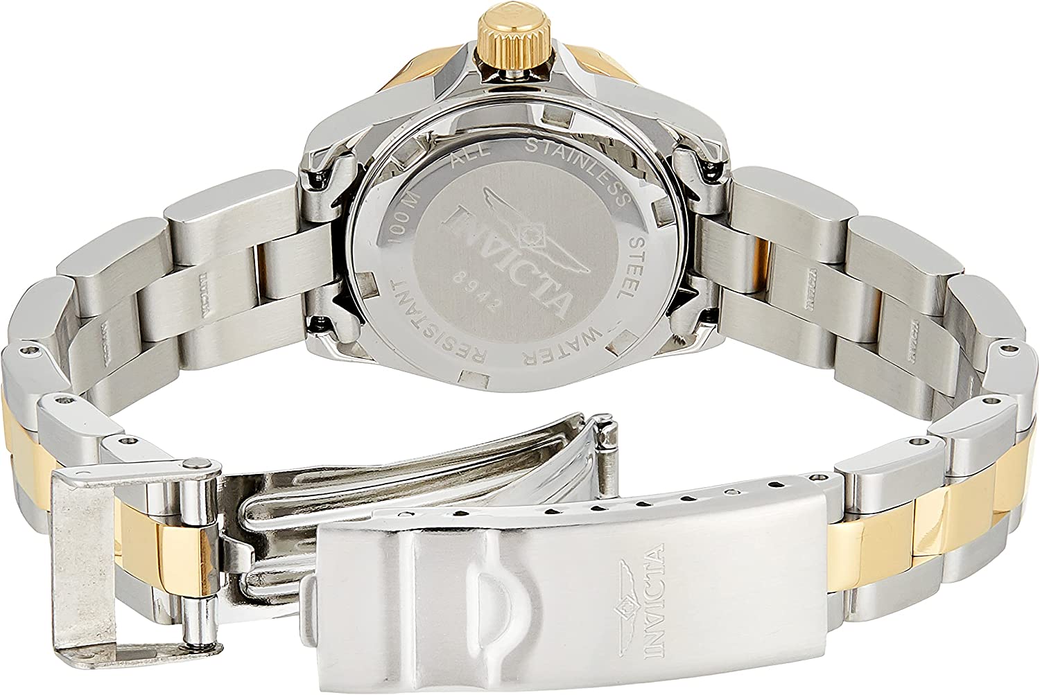 Steel and gold tone stainless steel band, 170mm L x 12mm W; Band is adjustable by adding/removing links; Fold over safety clasp
