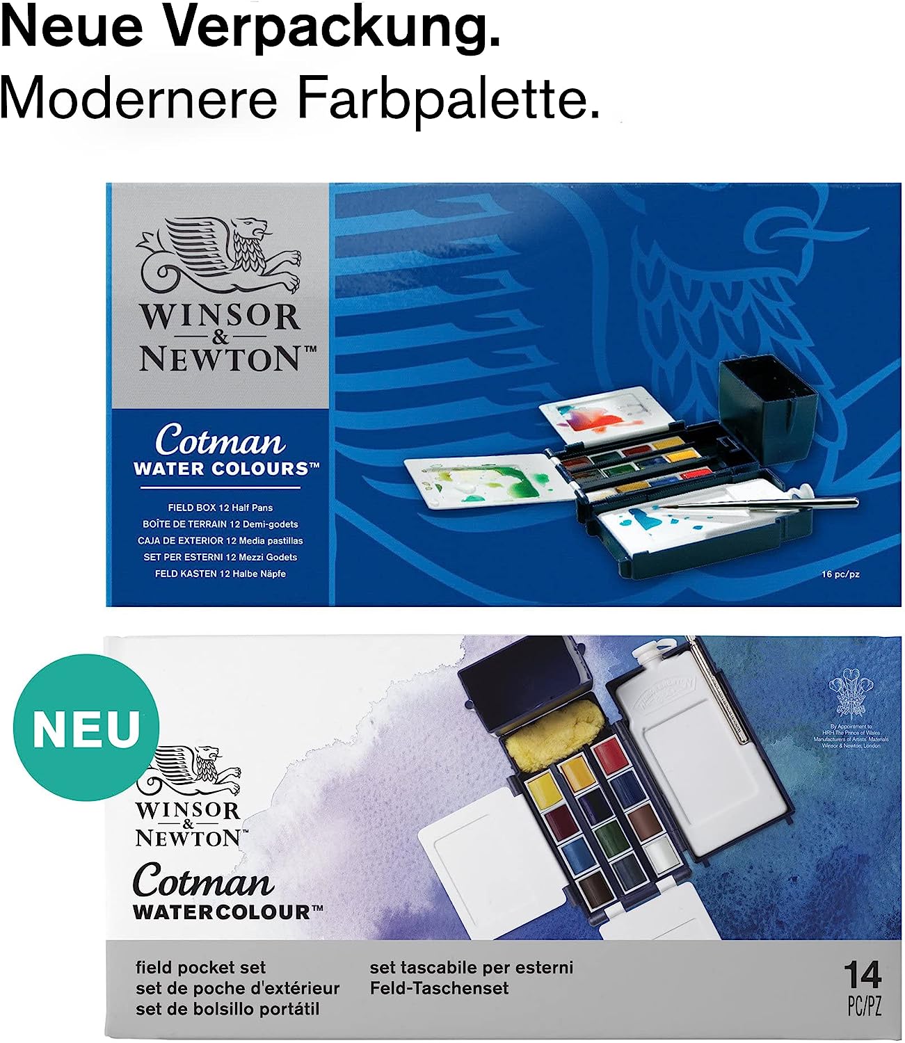 Winsor & Newton Cotman Water Colors are a range of water colors that are made to our normal high quality standards but costs are kept to an economical level by replacing some of the more costly pigments with less expensive alternatives. Each color has good transparency, excellent tinting strength and good working properties. This exclusive compact Field Box has been designed to be light-weight and fit snugly into the pocket while providing everything required for successful outdoor water color painting. Constructed in durable blue plastic, the Field Box includes: 12 Cotman Water Color half pans, a pocket brush, artists' sponge, 3 mixing areas, 35ml capacity water bottle, clip-on water container and an instructional leaflet. Colors included: Cadmium Red Pale Hue, Cadmium Yellow Hue, Cadmium Yellow Pale Hue, Alizarin Crimson Hue, Ultramarine, Cobalt Blue Hue, Sap Green, Viridian Hue, Burnt Umber, Yellow Ochre, Burnt Sienna and Chinese White.