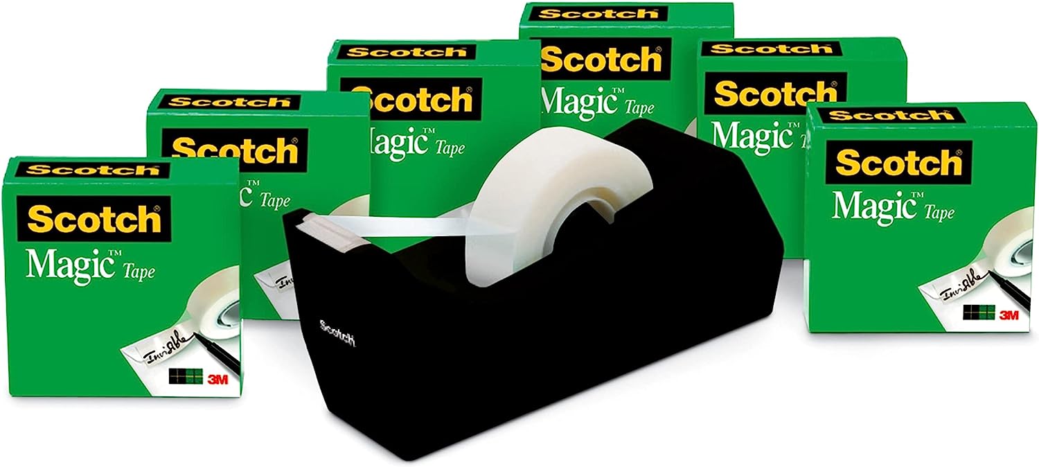 Scotch Magic Tape 810K6C38 Value Pack contains 6 rolls of tape and includes a Scotch C 38 classic black desktop office tape dispenser with weighted base. Scotch Magic Tape is the preferred tape for offices, homes and schools. It's invisible when applied and won't show on copies. This is an ideal tape for permanent paper mending. It can be written on with pen, pencil or marker, it pulls off the roll smoothly. Scotch Magic Tape cuts easily and is very reliable. Each roll of tape is 3/4 in. x 1000 in. with a 1 in. core. The tape is photo safe and made in the USA with globally sourced materials.