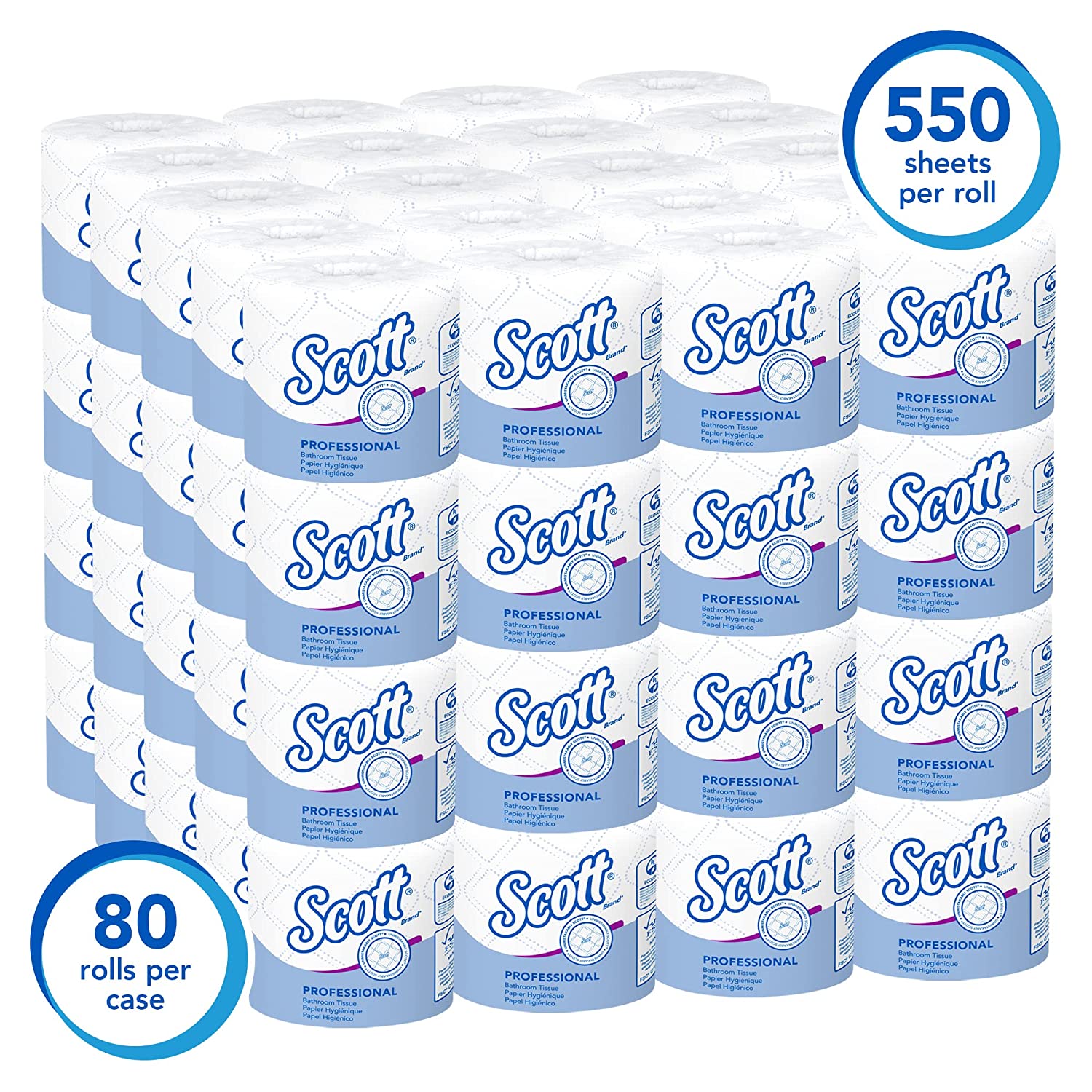 • 550 Sheets/Roll, 80 Scott Professional Standard Roll Toilet Paper Rolls/Case; 44,000 Sheets/Case; 2-Ply; White; Individually wrapped rolls; with Elevated Design