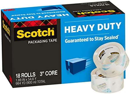 Scotch Heavy Duty Packaging Tape, 1.88" x 54.6 yd, Designed for Packing, Shipping and Mailing, Guaranteed to Stay Sealed, 3" Core, Clear, 18 Rolls (3850-18CP)