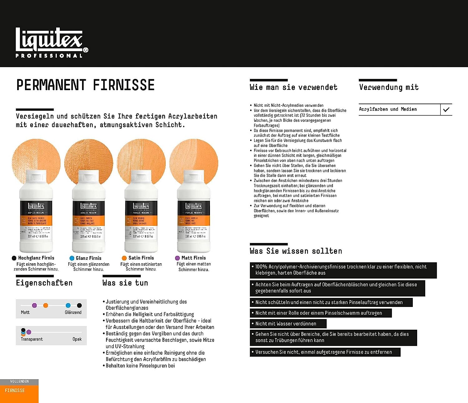 Liquitex offers the broadest range of acrylic mediums to inspire creativity at every stage of the painting process. Varnish Mediums protect the painting surface from the environment and protect the pigments from ultraviolet light. Additionally, varnishes can be used to change or unify a painting’s surface sheen. Liquitex varnishes come in several different sheens which can all be intermixed for a customized sheen. Liquitex Archival Permanent Varnish Finishing Medium is a low-odor, permanent and durable medium with water-based technology, translucent when wet, clear when dry.  Resists discoloring (non-yellowing, non-fogging) due to humidity heat and ultraviolet light.  Can be used with Spray Paint, Heavy Body, Soft Body.  Dries to a non-tacky, hard, flexible surface that is resistant to dirt retention.  Hard, archival, non-yellowing and water-resistant when dry.  Protects acrylic color from harsh elements.  For interior and exterior use. APPLICATION: Apply as a final varnish over dry acrylic paint. Varnish surface and environment must be clean, dry and dust free. Acrylic paintings must be completely dried and cured for 48-72 hours before varnishing. Application may be done by brush or spray. Generally a sprayed application will be thinner, smoother and more even. Rolling or sponging application is not recommended. Caution: Acrylic paints and mediums become increasingly brittle in cold weather. Do not apply below 60 degrees Fahrenheit. Visit our Liquitex Amazon Storefront for full product assortment.