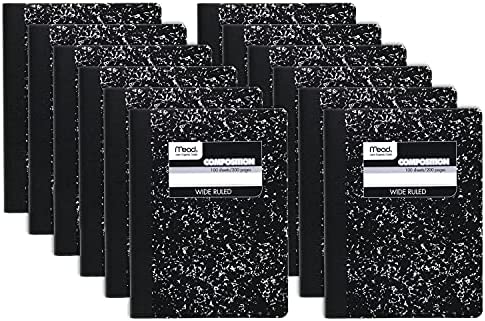 This Mead Composition Book is the classic choice for journaling and lab notes. Sheets measure 9 3/4" x 7 1/2". With 100 double-sided, wide ruled sheets, you’ll have plenty of space to take notes, journal, draw and more. Wide ruling is ideal for the younger student who needs more space between lines. Smooth binding keeps pages securely in place and won’t snag on your clothing or backpack. Black marble cover that includes a class schedule, multiplication tables, conversion tables and grammar rules. Sewn binding is smooth and keeps pages securely in place. Lays flat on any surface. Pack includes 12 composition books.