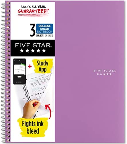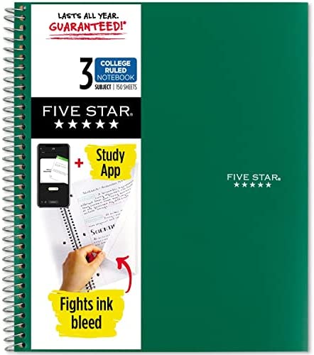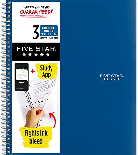 LASTS ALL YEAR. GUARANTEED!* This Five Star 3 Subject Notebook is full of features. Compatible with the Five Star study app, you can easily scan, study and organize notes on your phone! Create instant digital flashcards and sync notes to Google Drive and access them anywhere from any device. 3 subject notebook has 150 double-sided, college ruled sheets, which fight ink bleed. Sheets measure 8-1/2" x 11" and are perforated for easy tear out. Tough pockets help prevent tears and hold 8-1/2" x 11" loose sheets and handouts. Covers are water resistant to protect your notes and our Spiral Lock wire helps prevent snags on clothes and backpacks. Made with SFI certified paper. Notebook is recyclable – just remove the reinforcement tape on the pocket and recycle the rest! Available in Fire Red. *Guarantee is valid for one year from purchase date. Does not cover misuse.