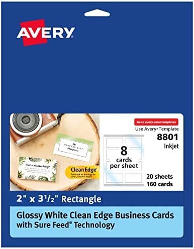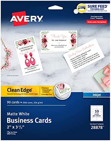Get professional quality business cards without having to pay the professionally printed price. Avery 8859 Clean Edge Business Cards includes 200 customizable business cards made from premium glossy cardstock (matte on back) with weight of 83lbs / 227gsm, and offers a high-quality blank canvas optimized for printing vibrant colors and sharp, clear text. If you need customizable business cards, customer loyalty cards, appointment reminder cards or more, these 2" x 3.5" cards are an exceptional way to stand out from the crowd. These white business cards have innovative Clean Edge technology for quick and easy separation, giving you the cleanest, smoothest edges of any business card on the market. Also, proprietary Avery Sure Feed technology helps reduce misalignments, minimize paper jams, and avoid wasted projects when printing on your inkjet printer. Whether you have your own design or you're creating one from scratch, take your brand or business to the next level with Avery Design & Print Online, which makes it easy to create and print double-sided customizable cards from your own home or business. The free browser-based software has everything you need to design business thank you cards, appointment cards, rsvp cards for weddings, reward cards and more. Try it out today on the Avery website and print at home or in the office on your inkjet printer.secures your card or insert in place, while the clear plastic badge window allows unobstructed visibility without needing to remove it from the holder. Each badge holder is pre-punched to accommodate the included 36" non-elastic neck cord or other attachment devices like clips, lanyards or reels (other attachments not included). These badge card holders are also compatible with Avery Badge Inserts 5390 and 5392 (inserts sold separately), making them great for custom name tags, name tags for kids and more. The size is also perfect to use as vaccine card holders (vaccine card sizes may vary, so please measure your card first to confirm fit). Item comes with 100 plastic badge holders and 100 neck cords.