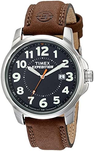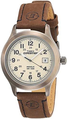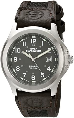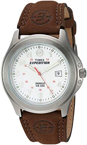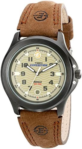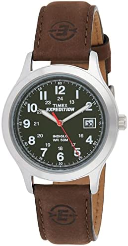 "While it looks like a casual watch, the full-sized Timex Men's T40051 Expedition Metal Field Brown Leather Strap Watch adds a stylish yet rugged complement to your everyday wear. It features a large, round silver-tone brass watch case with a flattened, brushed bezel that frames an olive green dial background with Arabic numerals, inset 24-hour notations, large, luminous stick hands (with seconds hand), and a date display at 3 o'clock. With the Quick Date function, you can set the date on the watch without turning the crown for every 24-hour period. Just pull the stem halfway out, and turn until desired date is reached. It also offers an 8-year battery life, water resistance to 165 feet (50 meters), and a durable genuine leather strap. The Indiglo night-light uniformly lights the surface of the watch dial using patented blue electroluminescent lighting technology. It uses less battery power than most other watch illumination systems, enabling your watch battery to last longer."