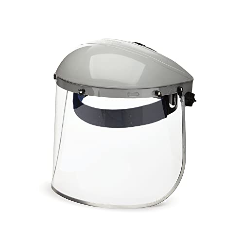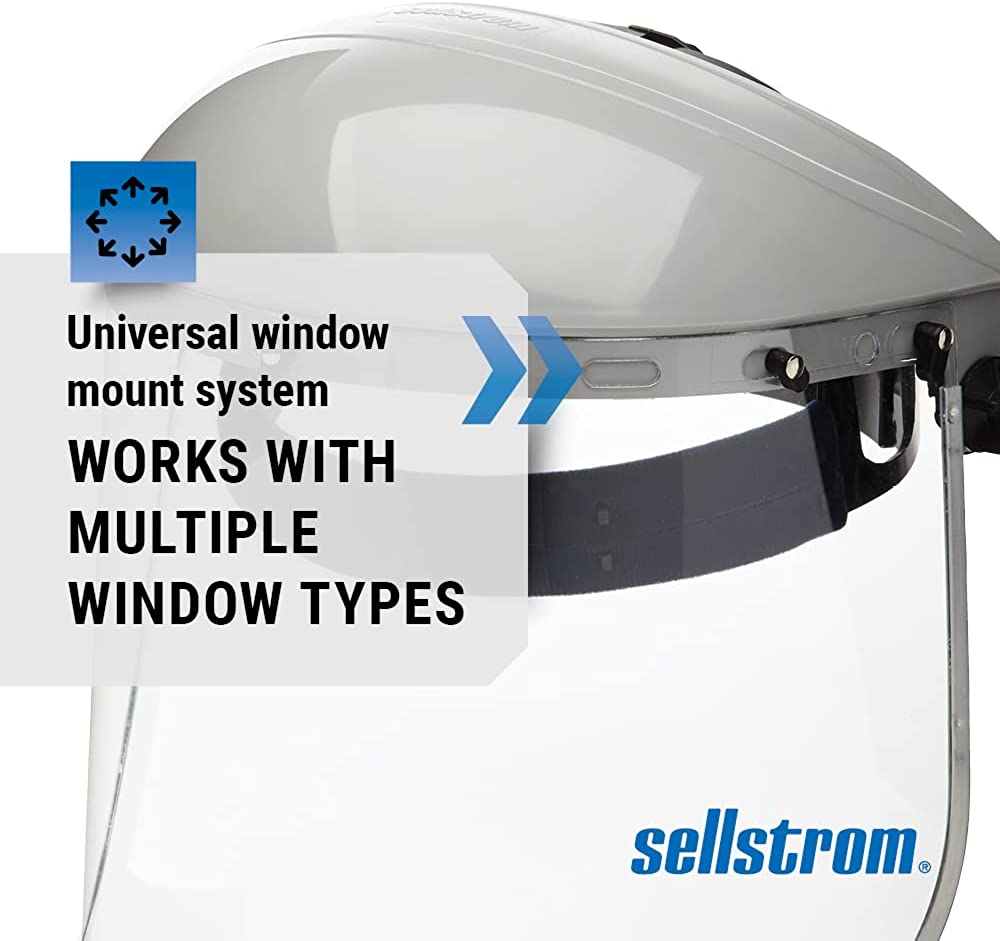• FACE SHIELD FEATURES: Includes a grey abs crown, uncoated clear polycarbonate window with aluminum binding and ratchet headgear and pin closure. Abs injection molded crowns have universal bracket pin pattern for use with any window mount