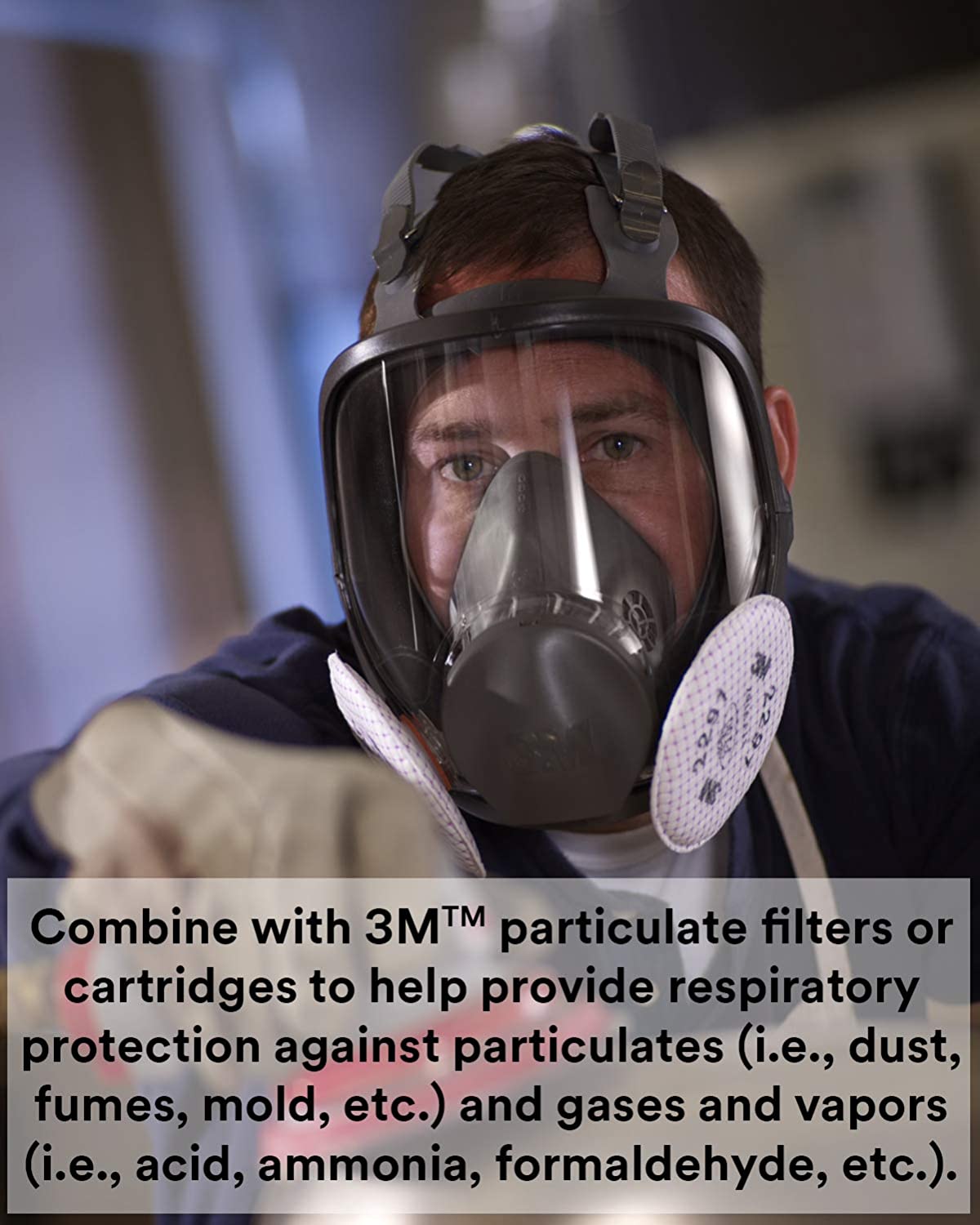 • Combine with 3M particulate filters or chemical cartridges to help provide respiratory protection against particulates (dust, fumes, mold, etc) and gases and vapors (paint, acid, chemicals, etc.)