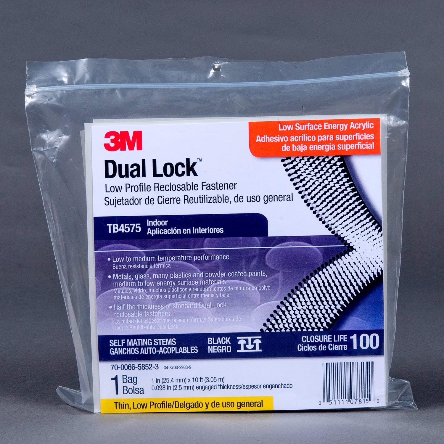 3M Dual Lock Low Profile Reclosable fastener. TB4570 is a low surface energy adhesive on the back of a clear polypropylene Reclosable fastener. This product is half the thickness of standard 3M Dual Lock Reclosable Fasteners, providing a low profile attachment. An alternative to screws and bolts, this hidden fastener provides a snug fit and smooth aesthetic appearance. A low surface energy adhesive on the back of a black polypropylene reclosable fastener. Low profile. 0.10 inch engaged thickness. Closure life 100.