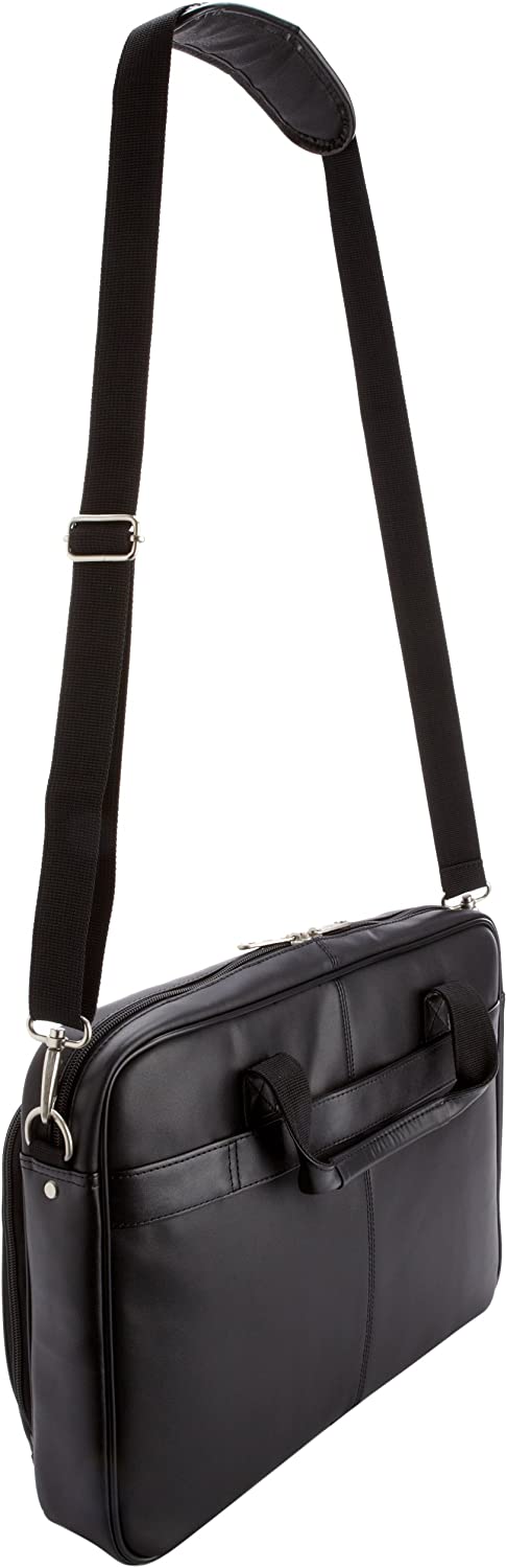 This Samsonite slim brief is crafted of genuine leather. It features a front, pocket organization for all of your business needs and padded, removable shoulder strap adjusts for convenience. The smart pocket slides over upright handles for easy mobility. Fits a 15.6" Laptop computer. Body dimension: 15.75 x 11.6 x 2.5 inches, Overall Dimension: 15.75 x 11.6 x 2.5 inches.