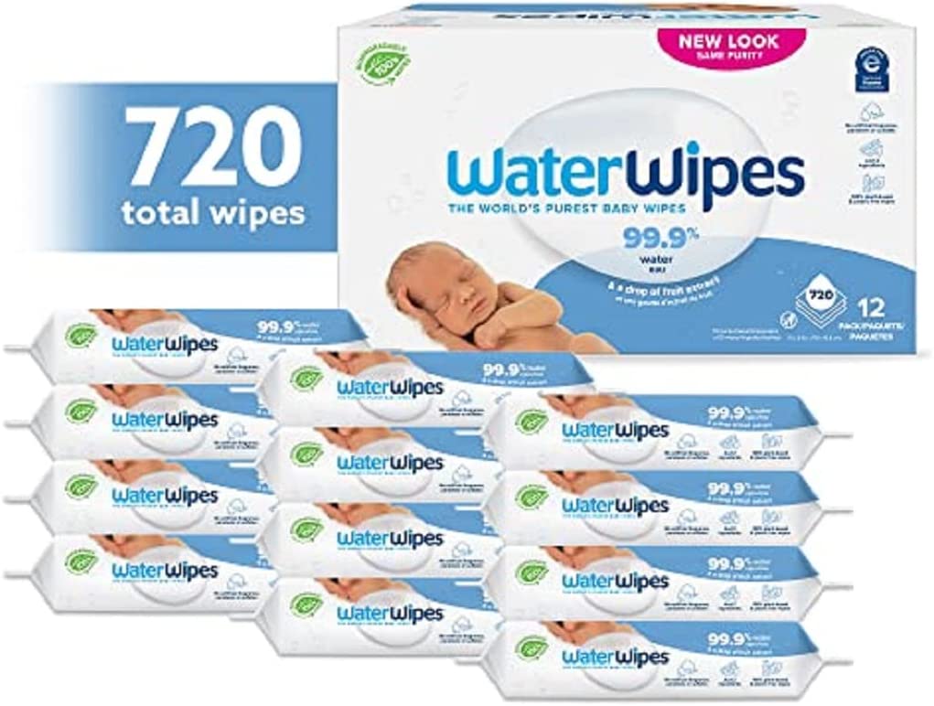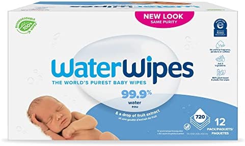 WaterWipes Plastic-Free Original Baby Wipes, 99.9% Water Based Wipes, Unscented & Hypoallergenic for Sensitive Skin, 720 Count (Pack of 12), Packaging May Vary