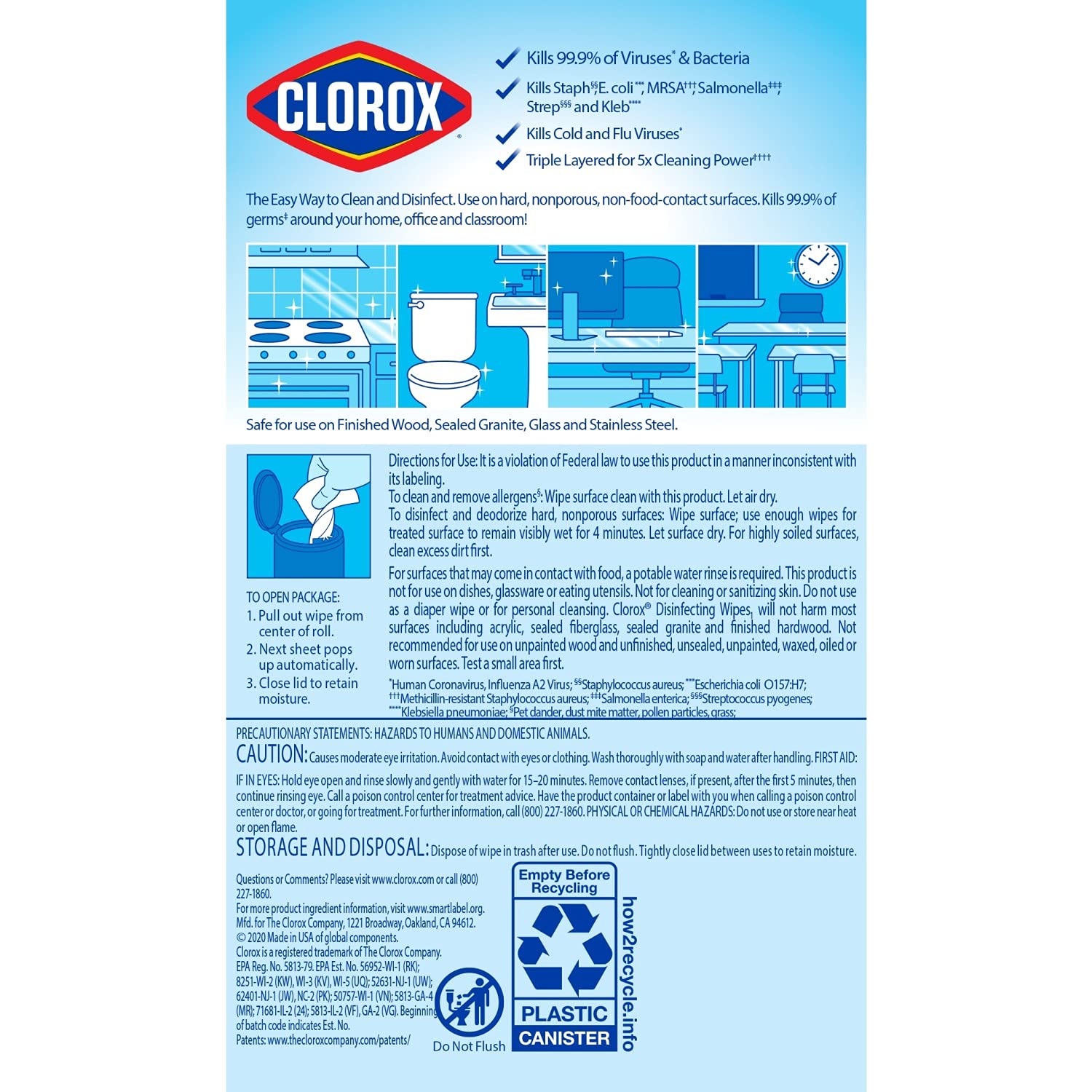 - MULTI-SURFACE CLEANER: Wipes are safe for finished wood sealed granite and stainless steel and on non-food-contact surfaces in the home office classroom pet area dorm and locker room