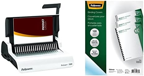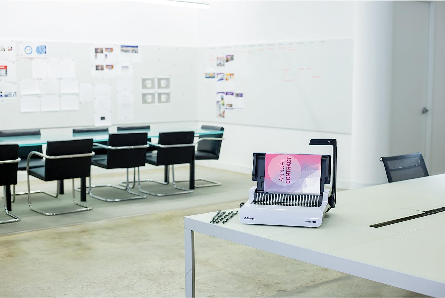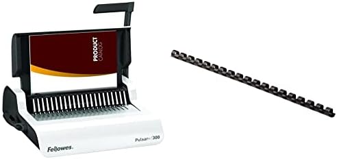 The full-featured, medium duty Fellowes Pulsar Plus Comb Binding Machine is ideal for general office use. Compact machine manually punches up to 18 sheets at a time and binds up to 300 sheets with a 1-1/2-Inch comb. Vertical document loading ensures accurate punch alignment. Efficient design allows user to punch and bind in a continuous manner. Features built-in comb storage tray with document measurement device for added convenience and quick set-up. Adjustable edge guide centers documents with ease. Includes binding starter pack (contents: 10 pk assorted kit).
