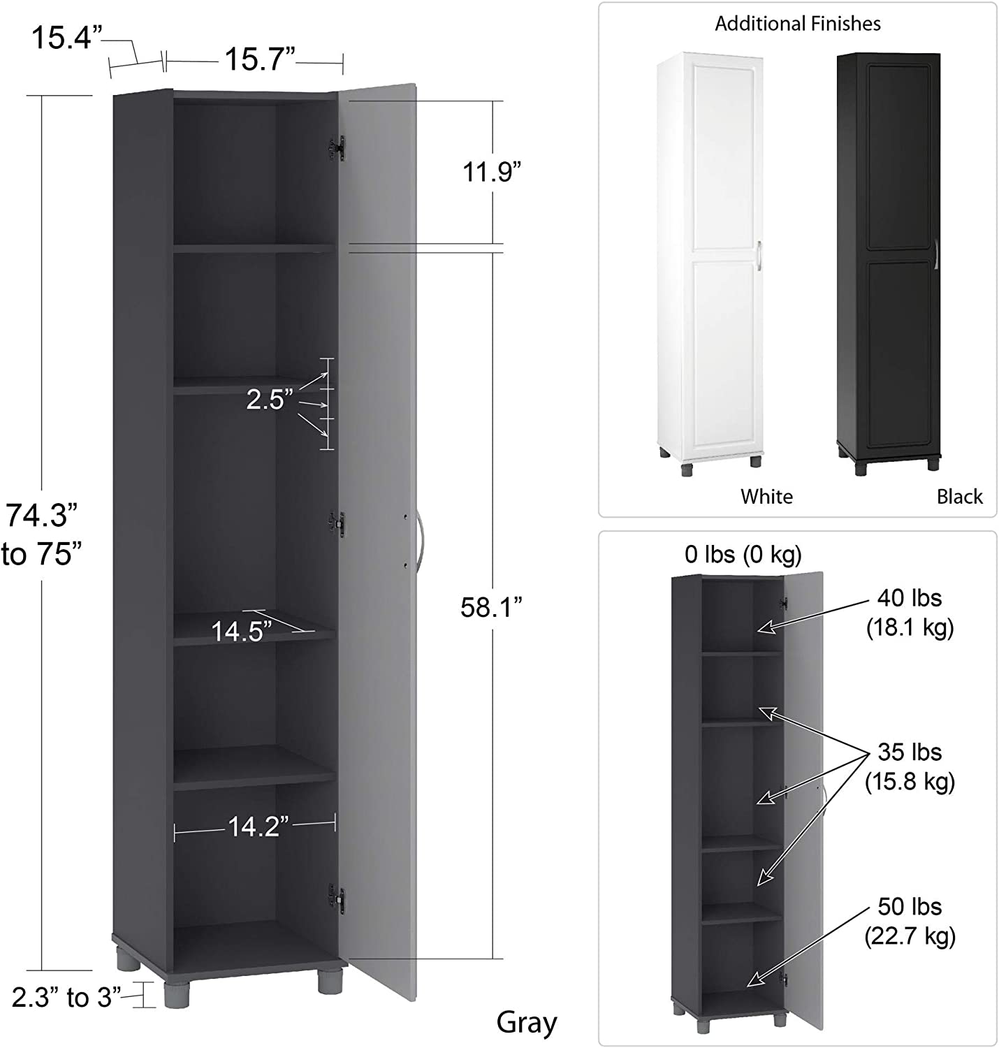 The Storage Cabinet ships flat to your door and 2 adults are recommended to assemble. Each shelf will hold up to 35 lbs. Assembled dimensions: 74. 3125”H x 15. 6875”W x 15. 375”D