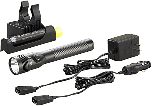 The Streamlight 75458 Stinger DS LED HL is a high lumen flashlight that provides 800 lumens of maximum illumination. Its wide beam pattern gives you a bright flood light that will light up the area around you, and the switches on the head and tail cap provide maximum versatility. Compact and extremely powerful, the Stinger DS LED HL rechargeable flashlights offer 3 microprocessor-controlled intensity modes, strobe mode and the latest in high power LED technology. The Stinger DS LED HL includes a second independent easy to locate tactical tailcap switch. The combination of rechargeable batteries and the C4 LED results in one of the lowest operating costs of any flashlight made. 3 Lighting Modes plus Strobe. High for maximum illumination: 800 lumens; 310m beam, runs 1.5 hours, 24,000 candela; Medium for intense brightness and longer run time: 400 lumens, 219m beam, 2.5 hours, 12,000 candela; Low for extended run time: 200 lumens, 155m beam, runs 5 hours, 6,000 candela. 3-Cell, 3.6 Volt Ni-MH sub-C battery, rechargeable up to 1000 times. Smart PiggyBack charger: Fully recharges within 7.5 hours (5V/1A USB input) or 4 hours (12V DC input). Machined aircraft aluminum body with non-slip rubberized comfort grip; anti-roll rubber ring included. IPX4 water-resistant; 1 meter impact resistance tested. Unbreakable polycarbonate lens with scratch-resistant coating. LED technology, impervious to shock with a 50,000 hour lifetime. 8.85” (22.48 cm); 12.8 oz (364 g). Serialized for positive identification. Limited lifetime warranty.