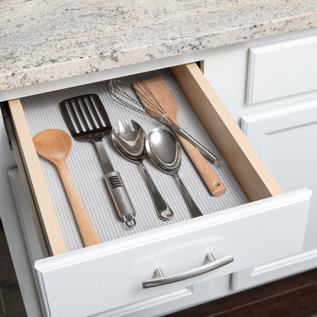 Featuring a non-adhesive grip top and bottom, you can use Select Grip EasyLiner Brand Shelf Liner in almost any type of drawer or utility cabinet to protect against scratches and keep your items in place. This shelf liner is easy to remove or replace and is available in a variety of colors, making redecorating a breeze. Pro Tip: Cover narrow drawers and cabinets with 12" and use 20" for large drawers and cabinets.