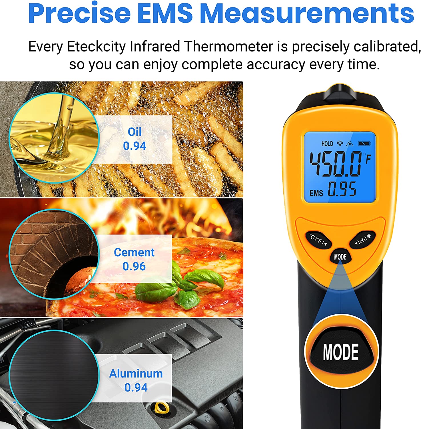 Professional EMS Mode: The Lasergrip 1080 Infrared Thermometer has an emissivity range of 0.1–1.0 for precise readings across different surfaces and conditions; Adjust the emissivity by pressing and holding the Up and down buttons on the heat gun