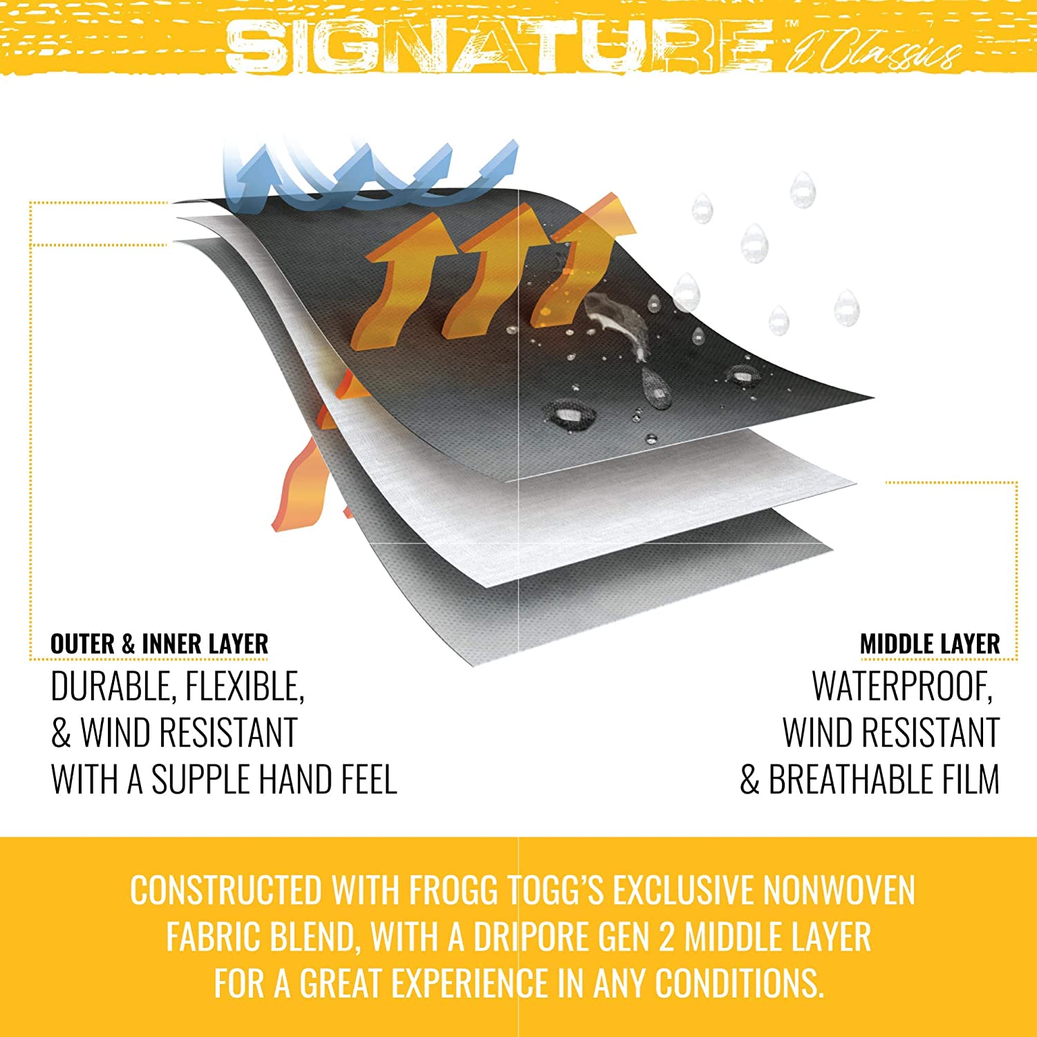 • WATERPROOF – constructed with lightweight and reliable frogg toggs exclusive nonwoven fabric blend with DRIPOR GEN2 middle layer with pores 20,000x smaller than a drop of water, fully taped Polypropylene outer layer for added waterproof durability