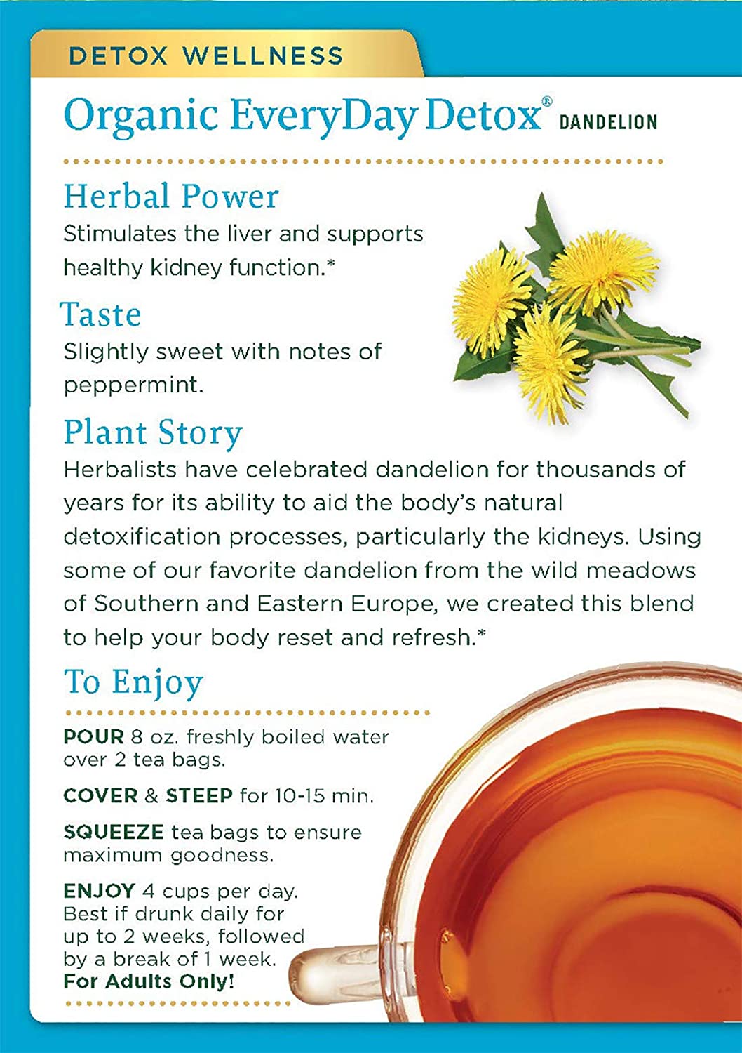 • Using some of our favorite dandelion from the wild meadows of Southern and Eastern Europe, we created this EveryDay Detox tea to help your body reset and refresh.*