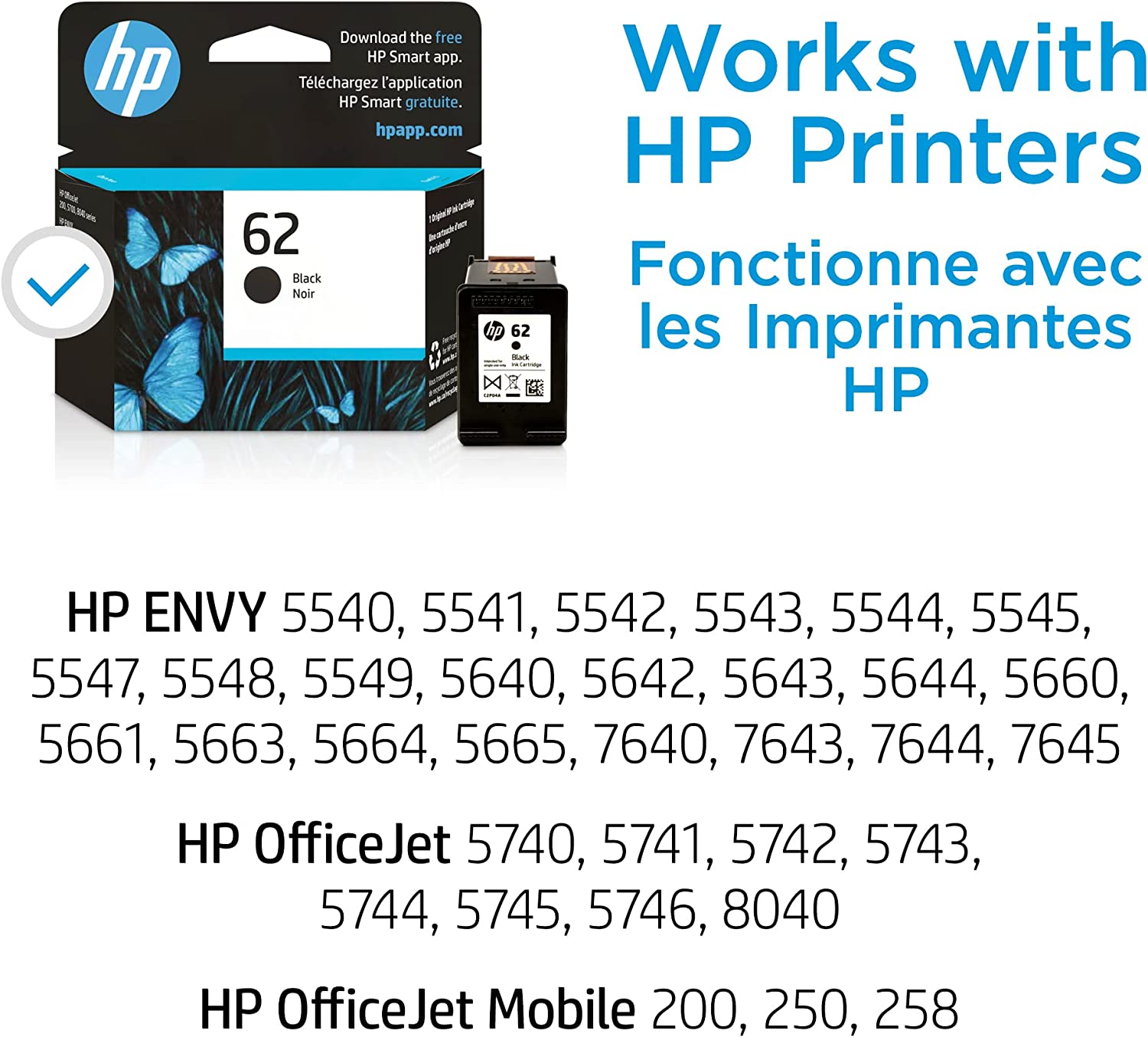 HP 62 Black Ink Cartridge | Works with HP ENVY 5540, 5640, 5660, 7640 Series, HP OfficeJet 5740, 8040 Series, HP OfficeJet Mobile 200, 250 Series | Eligible for Instant Ink | C2P04AN