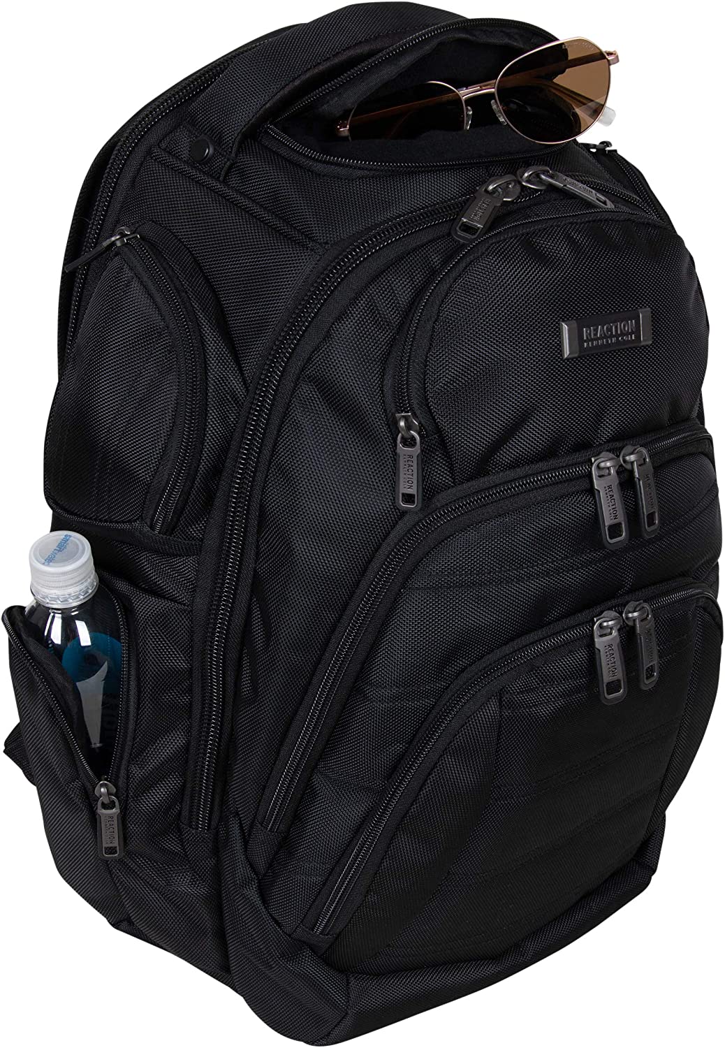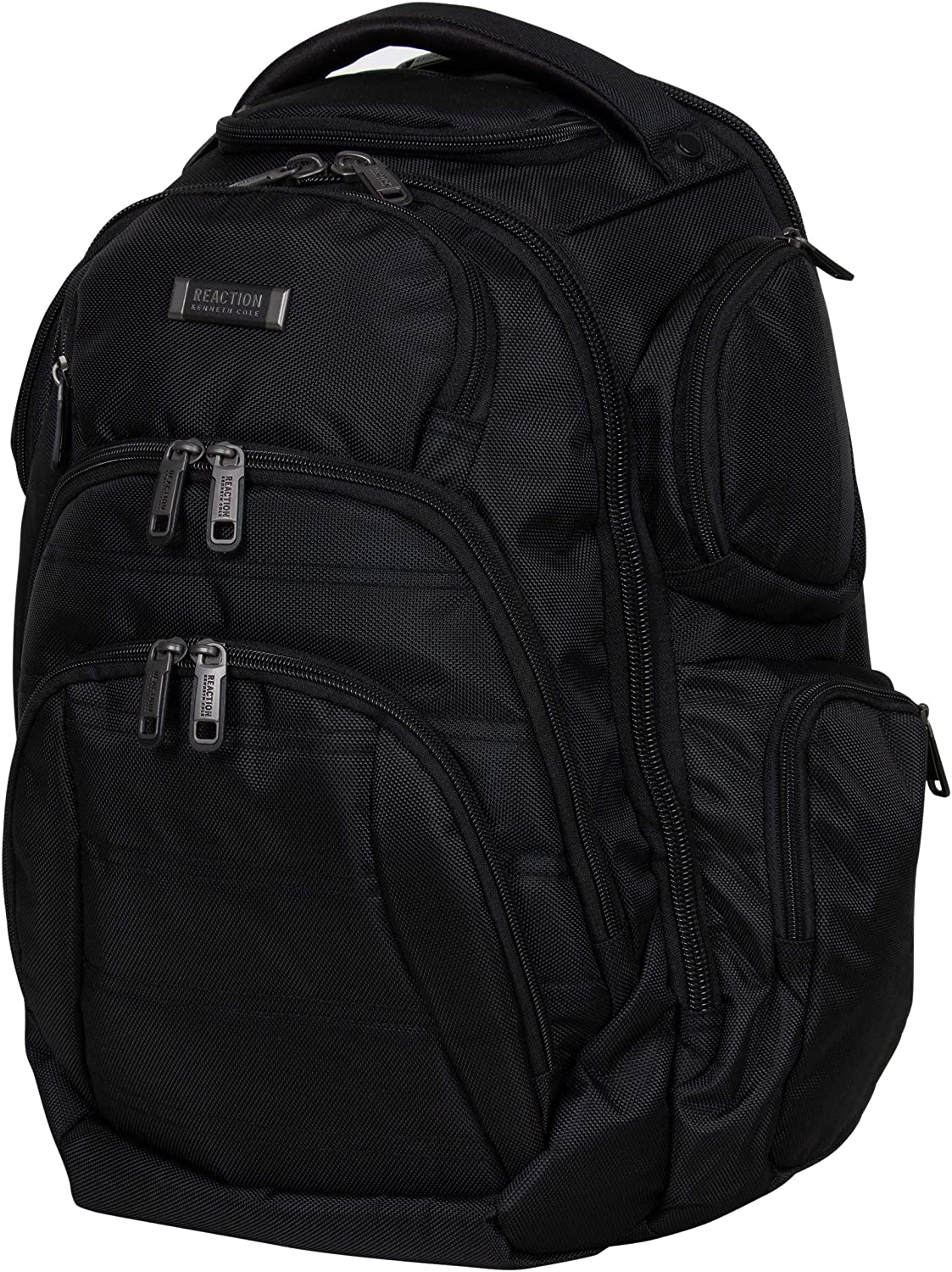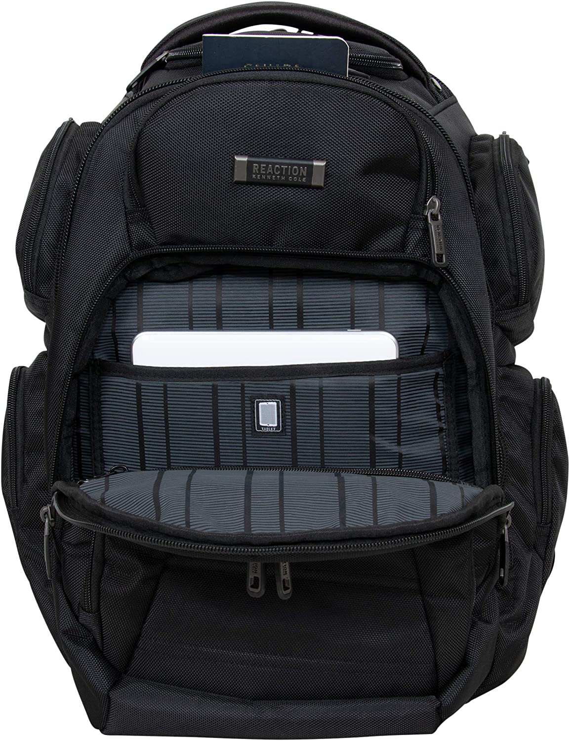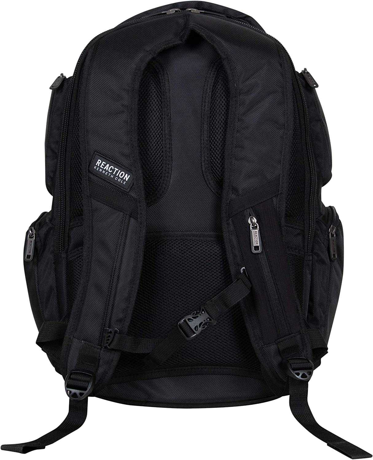 • modern mobility: This Kenneth Cole REACTION pack-of-all-trades 17-inch Laptop backpack features multiple accessory pockets and multiple compartments to keep all your travel essentials organized. Sturdy and comfortable padded top handle. Features ultra padded air mesh back with air Flow channels and upright trolley tunnel. Padded ergonomic shoulder straps for ultimate comfort, also includes a zipper pocket.