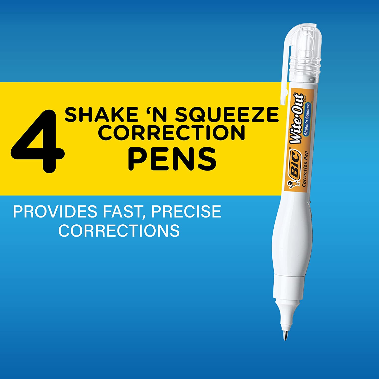 • One 4-count pack of BIC Wite-Out Brand Shake 'n Squeeze Correction Pen, each pen containing 8ml of white liquid correction fluid