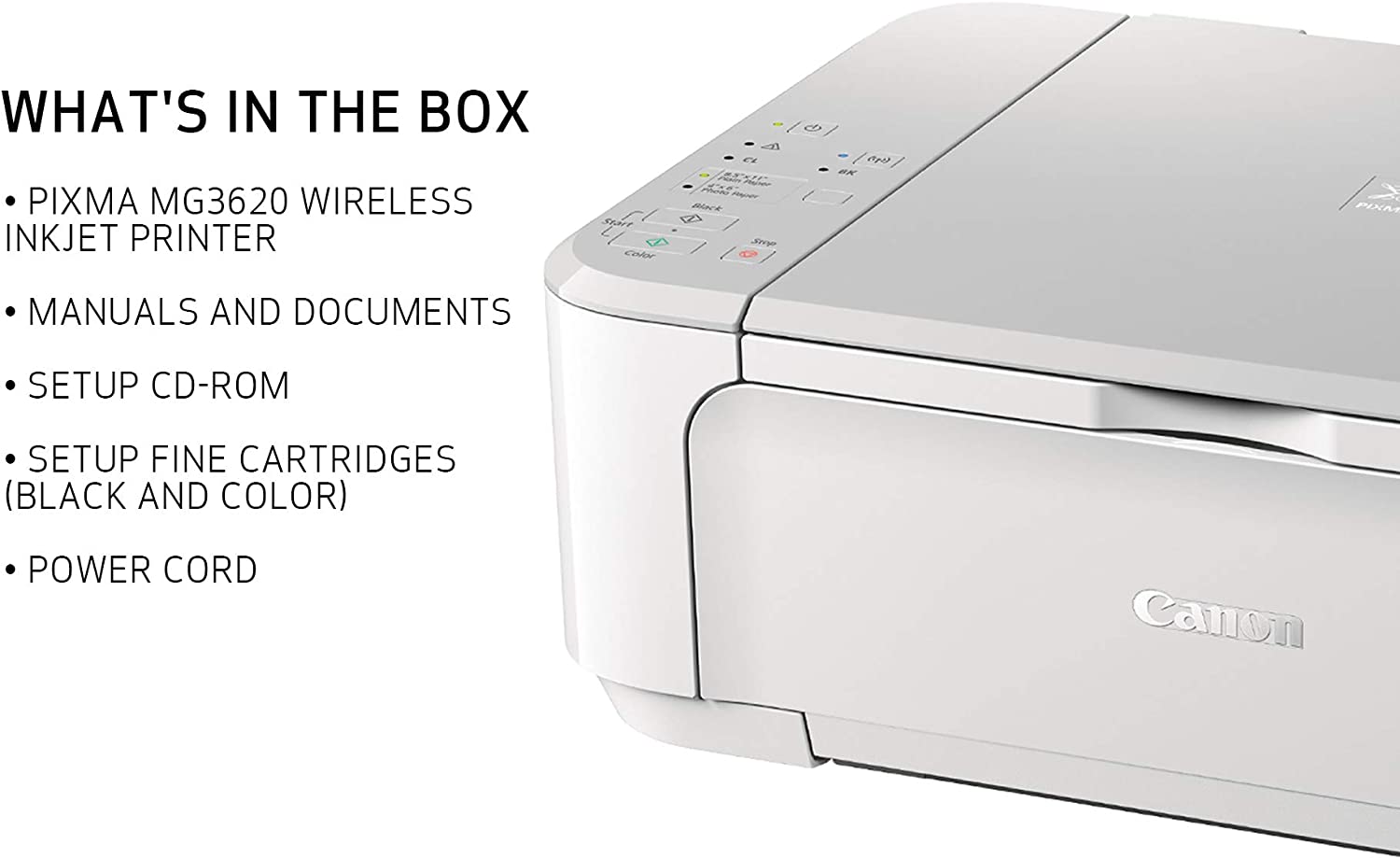 • Mobile device printing: Easily print from your iPhone, iPad, Android or tablet.In The Box : PIXMA MG3620 Wireless Inkjet All-In-One Printer, Manuals and other documents, Setup CD-ROM, FINE Cartridges (Black and Color), Power Cord