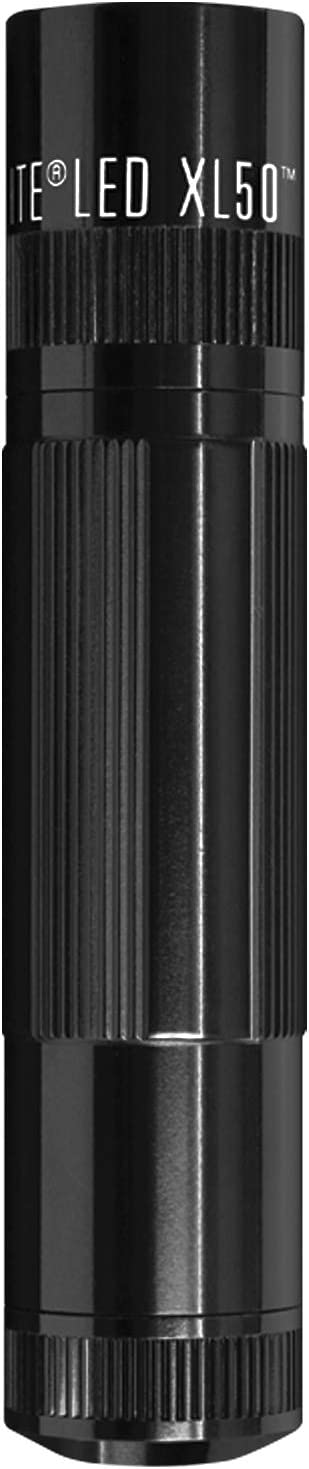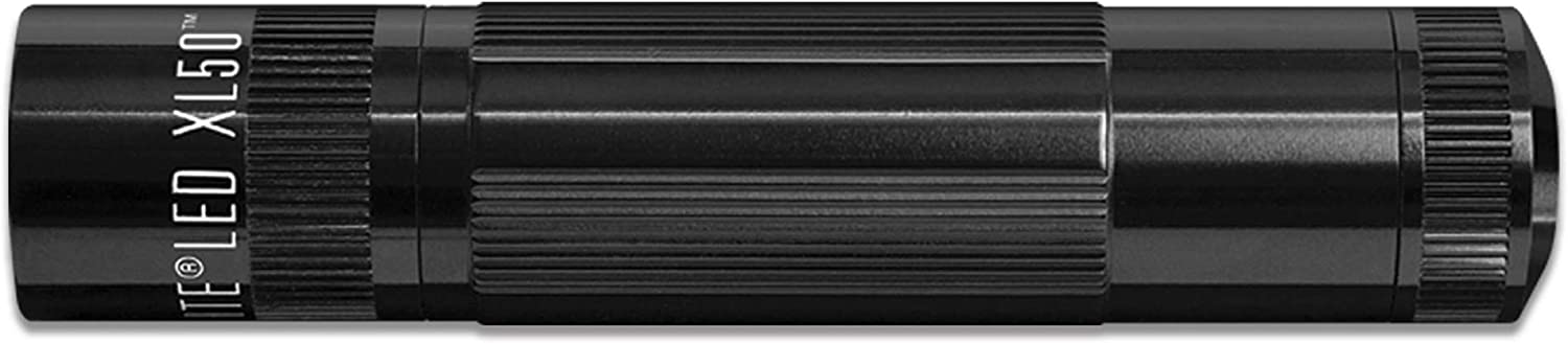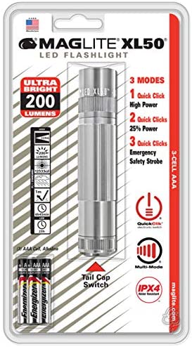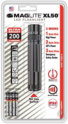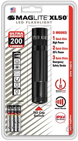 Introducing the Maglite XL50 3-cell AAA LED flashlight. The Maglite LED XL50 flashlight, with its compact, pocket-size design and adjustable LED spot-to-flood beam, features a rear push-button tail cap switch coupled with three modes: high power, 25% energy save power, and emergency strobe. This flashlight has an impact-resistant and durable aluminum casing that helps keep it protected. With Intelligent Energy Source Management, the brightness and effective power usage is continuously monitored, allowing for prolonged battery life. Uses three AAA alkaline batteries (included).