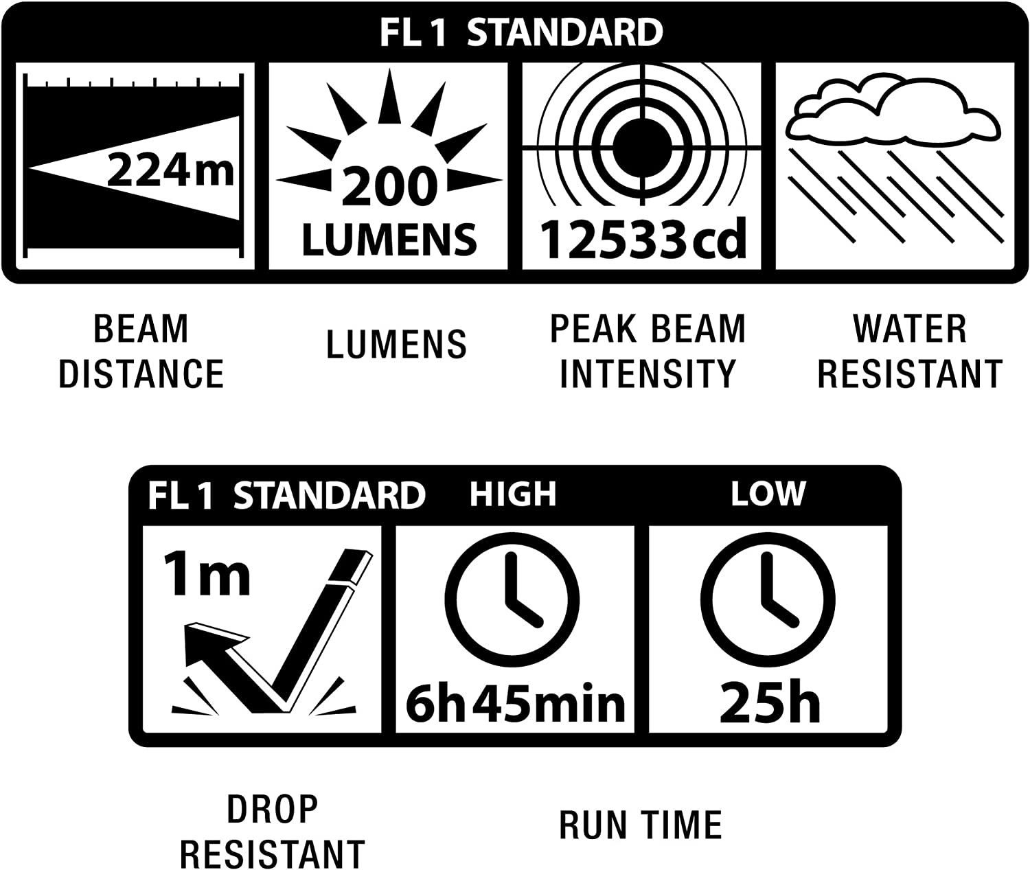 Mini Flashlight, Flashlight Grade Tactical, Lamp Type LED, Flashlight Battery Size AAA, Rechargeable No, Flashlight Battery Type Alkaline, Number of Batteries 3, Batteries Included Yes, Battery Burn Time 6.8 hr., Length 4.80 In., Body Dia. 1.00 In., 200 Lumens, Lumens Range 100 to 249, Run Time on High Setting 6.8 hr., Maximum Lumens Output 200, Body Color Black, Body Material Aluminum, Switch Type Twist, Lens Material Polycarbonate, Beam Distance 224m, Light Output Modes High / Low