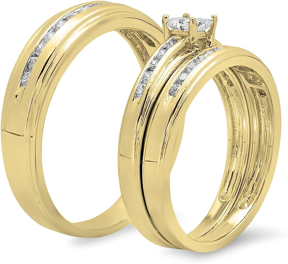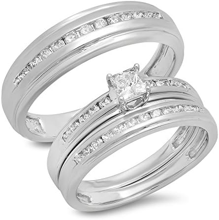 Dazzlingrock Collection Princess & Round White Diamond Square Frame Head Tapered Shank Elegant Wedding Trio Ring Set for Him & Her 7/8 CT (0.85 ctw, Color I-J, Clarity I2-I3) in 10K Gold