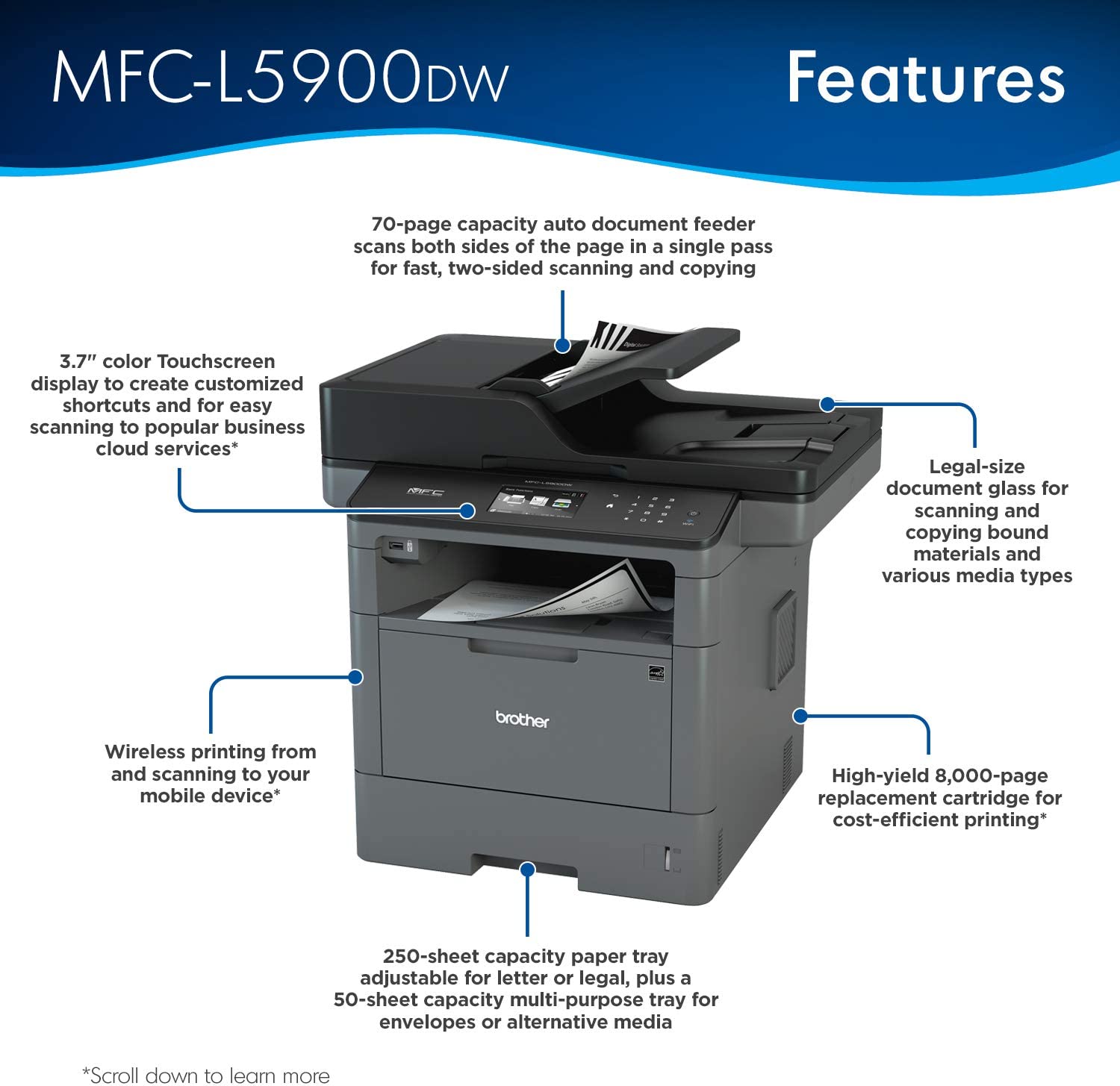 Perfectly designed for busy office and small workgroups looking for reliable performance and cost-effective output, the Brother MFC-L5900DW Monochrome Laser All-in-One is the go-to solution you’ve been looking for. Fast print and copy speed of up to 42ppm will help increase your productivity, and the cost-efficient output, thanks to the high-yield replacement toner cartridge, will help lower your operating costs. The MFC-L5900DW also offers flexible paper handling, with a 300-sheet paper capacity. This all-in-one can be expanded to a 1,340 sheet-capacity with optional trays (LT-5500, LT-6500). A 70-page capacity automatic document feeder allows you to complete large-volume scanning and copying projects while you focus on other tasks. This system also offers two-sided printing, letting you save money on paper and resources. The MFCL5900DW offers built-in wireless and Ethernet interfaces and mobile device printing and scanning via AirPrint, Brother iPrint&Scan, and Wi-Fi Direct(2). The 3.7-inch touchscreen allows you to scan and print from popular business cloud services, including Dropbox, Evernote, Google Drive, and more(1). This Brother monochrome laser multifunction printer offers advanced security features to keep your documents, network and devices secure. The Brother MFC-L5900DW Business Laser All-in-One is also Amazon Dash Replenishment enabled, which means that you never have to run out of toner when you activate this automatic fulfillment system. This Brother all-in-one is backed by a one-year limited warranty and free at-your-side support for the life of your product, featuring online, phone, or live chat assistance.(1)Requires an Internet connection and an account with desired service. (2)Requires connection to a wireless network.