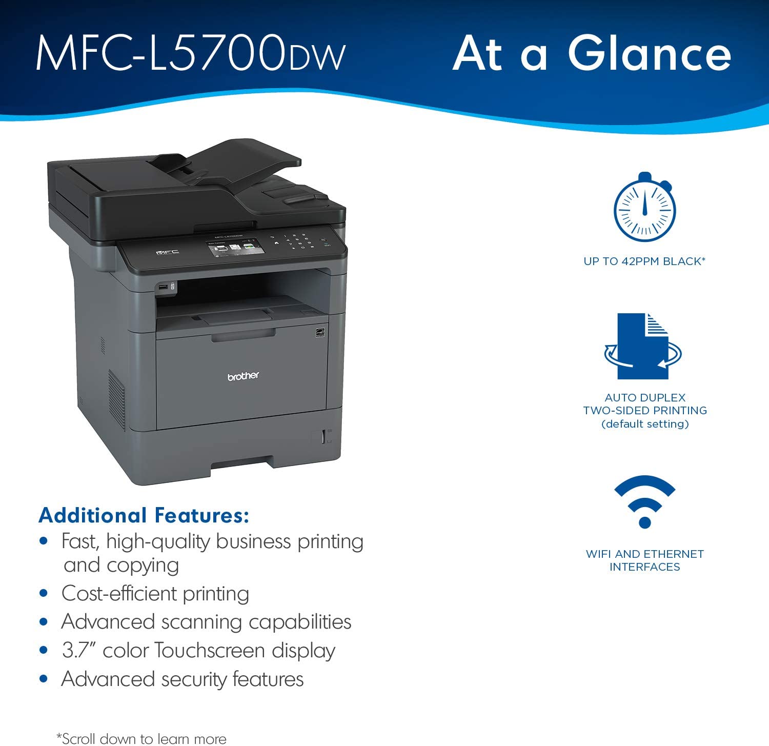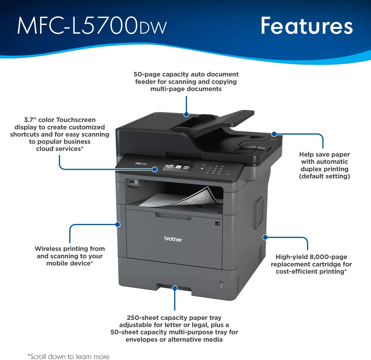 Brother All-in-One Laser Printer MFC-L5700DW was engineered to help enhance your workflow’s productivity with a print and copy speed of up to 42 pages per minute. (2) This high-performance all-in-one produces professional spreadsheets, reports, correspondence, and other important business documents with crisp graphics and text. Plus, this small office printer, copier, scanner, and fax machine offers simultaneous operation (for example, printing and scanning at the same time) so that multiple workgroup members can use the machine at once without experiencing slow-downs. A 3. 7” touchscreen makes menu navigation easy and permits you to create up to 48 customized shortcuts. The MFC-L5700DW offers flexible connectivity through a built-in wireless 802. 11b/g/n and Ethernet interface that allows multiple users to safely and securely submit tasks. Plus, scan to popular business cloud services directly from the touchscreen, including Evernote, Dropbox, Google Drive, OneNote, and more. (3) Users can also connect to the Brother Laser All-in-One through their mobile devices via popular mobile apps such as Brother’s free iPrint&Scan app, Cortado Workplace, AirPrint, and Wi-Fi Direct. (1, 3) For those with USB flash memory drives, printing is simple thanks to a built-in USB host located on the front of the machine. This business all-in-one is great for small to medium businesses that require flexible paper handling. The adjustable 250-sheet capacity paper tray and 50-sheet multipurpose tray make printing and copying simple. Users can upgrade all the way to 1, 340-sheet total capacity with optional trays (LT-5500, LT-6500). The Business Laser All-in-One is also very secure, utilizing Active Directory, Secure Function Lock, SSL Security, and more. Brother offers a 1-year limited and phone support for the lifes of your product. The MFC-L5700DW is also Dash Replenishment enabled. This system allows the printer to measure the toner level of your Genuine Brother Replacement Cartridges and automatically order replacements. This ensures you never run out of toner so that you can maintain the office efficiency you expect and require. (1)Requires connection to a wireless network. (2)Based on one-sided printing. Change from default setting required. (3)Requires an Internet connection and an account with desired service. (4)Approximate toner cartridge yield in accordance with ISO/IEC 19752 (letter/A4).