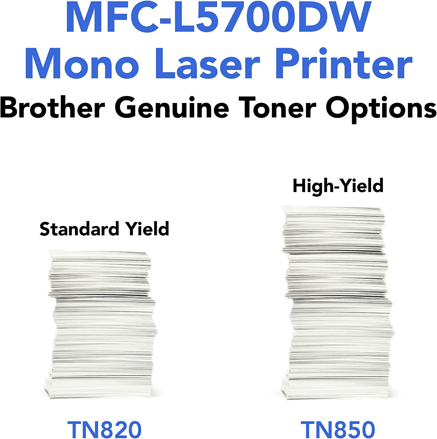 • For use with brother genuine toners: TN820 standard yield toner, TN850 high yield toner for cost efficient printing. Standard paper input capacity 250 sheets. Multi-purpose tray capacity 50 sheets. Optional paper capacity 250 sheets x2 with LT-5500 tray, or 520 sheets x2 with LT-6500 tray. Output paper capacity 150 sheets. Automatic document feeder capacity max. 50 pages