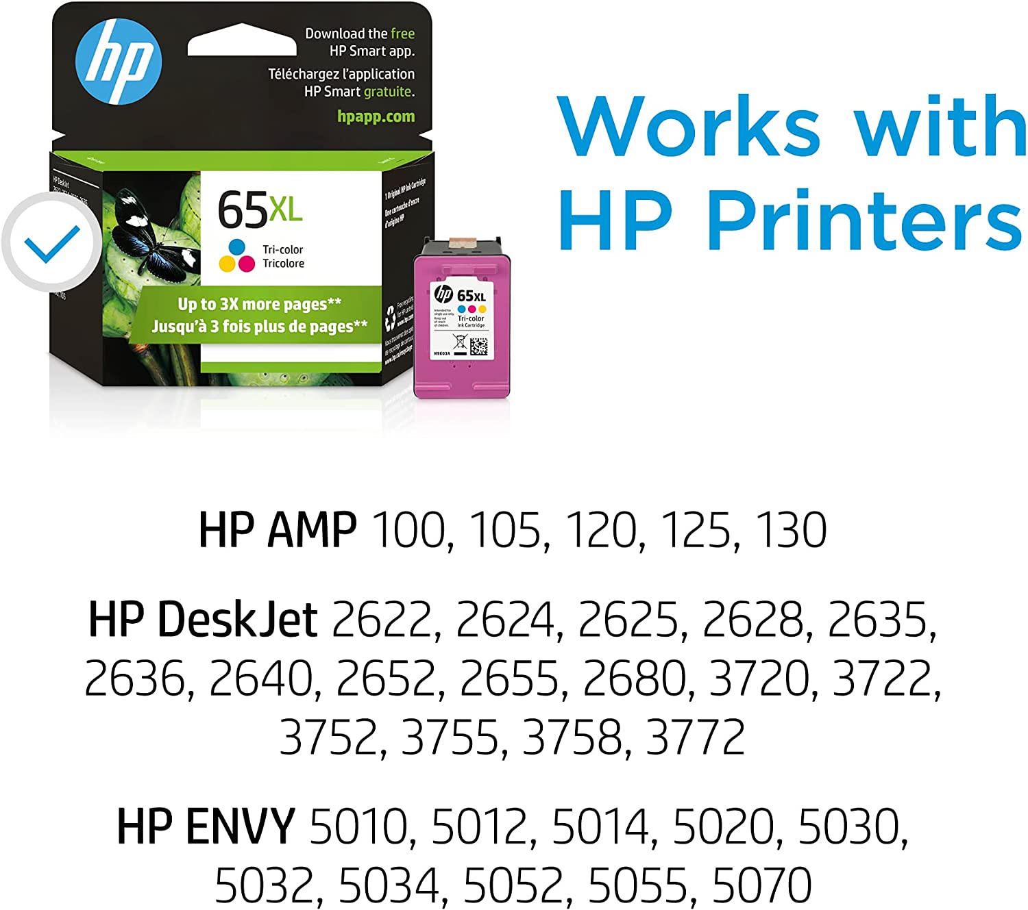 • This cartridge works with: HP AMP 100, 105, 120, 125, 130; HP DeskJet 2622, 2624, 2625, 2628, 2635, 2636, 2640, 2652, 2655, 2680, 3720, 3722, 3752, 3755, 3758, 3772; HP ENVY 5010, 5012, 5014, 5020, 5030, 5032, 5034, 5052, 5055, 5070