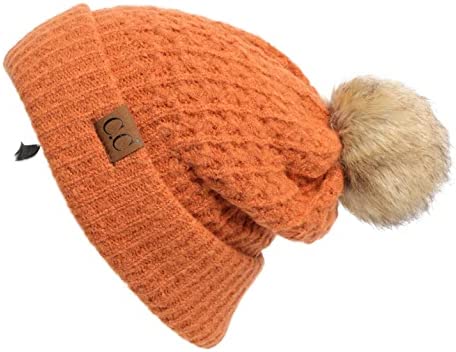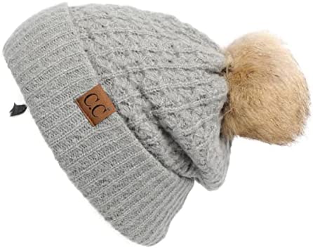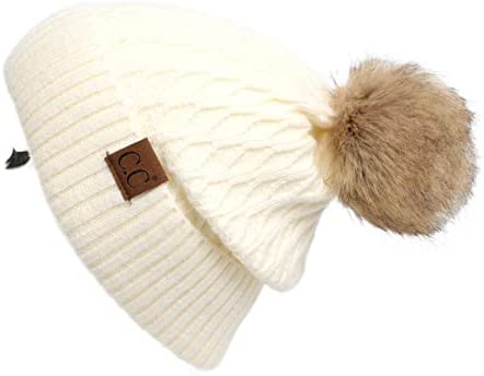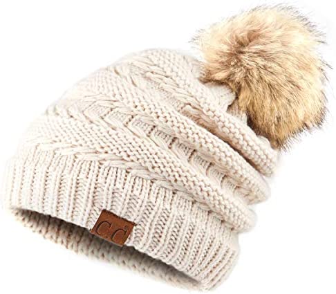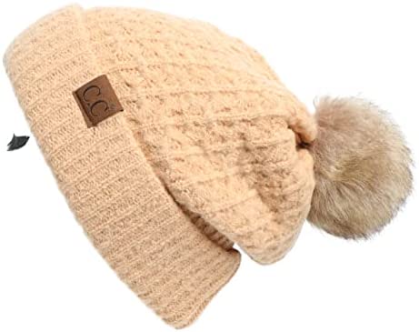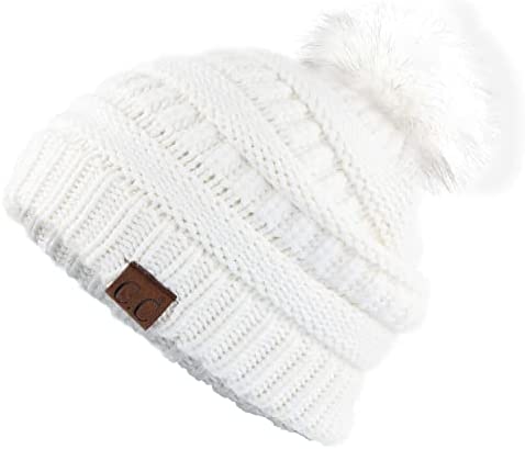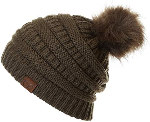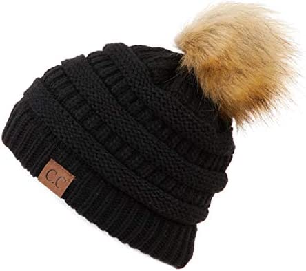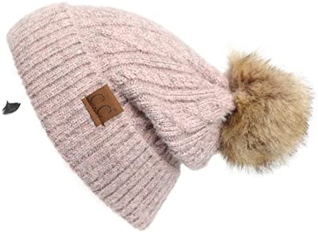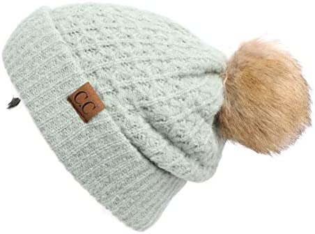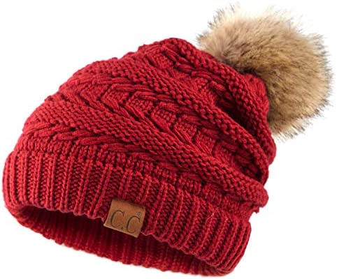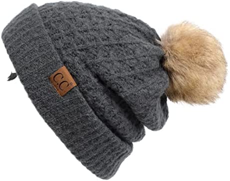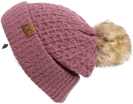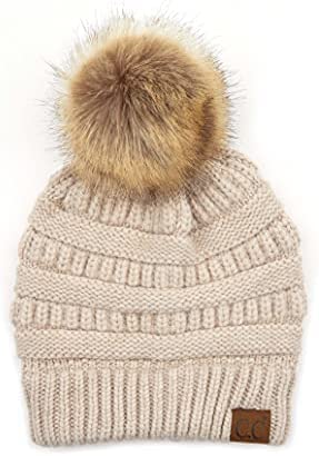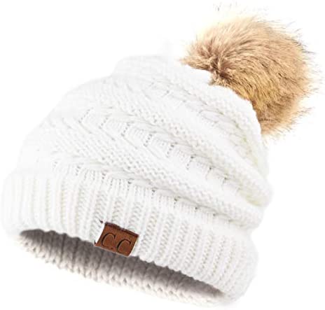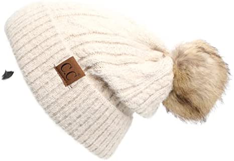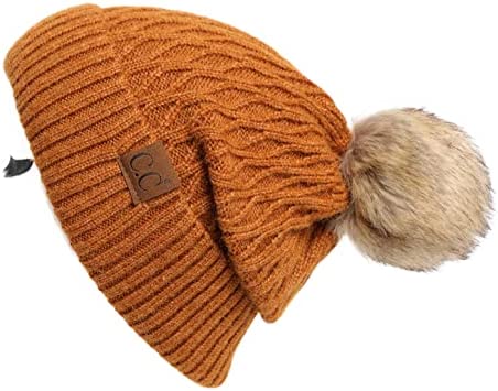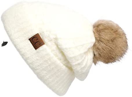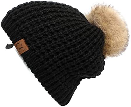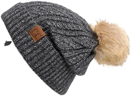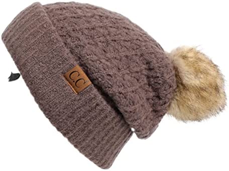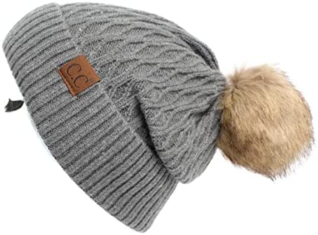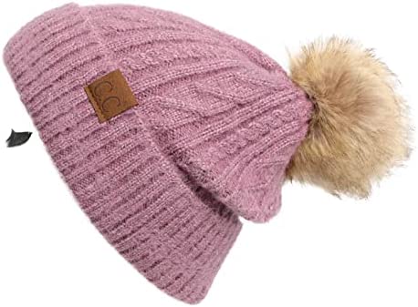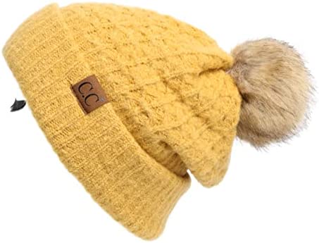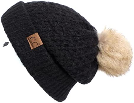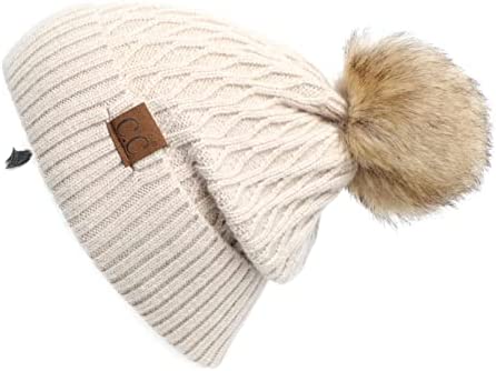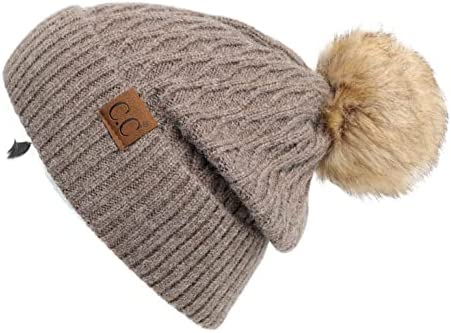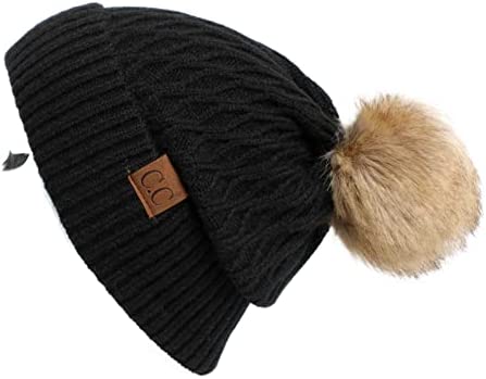 C.C Thick Cable Knit Faux Fuzzy Fur Pom Fleece Lined Skull Cap Cuff Beanie