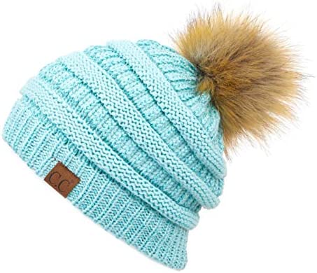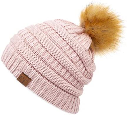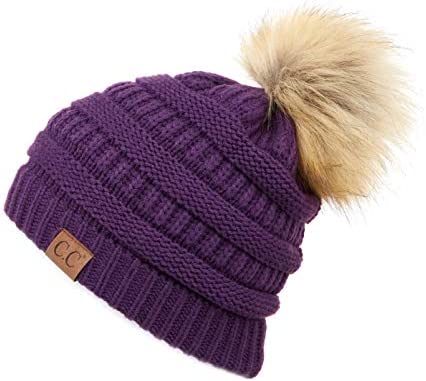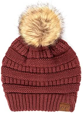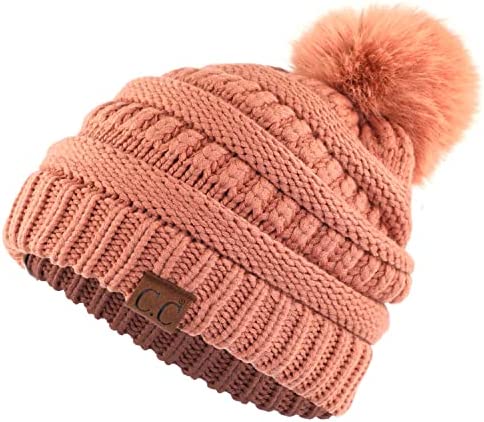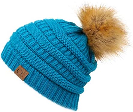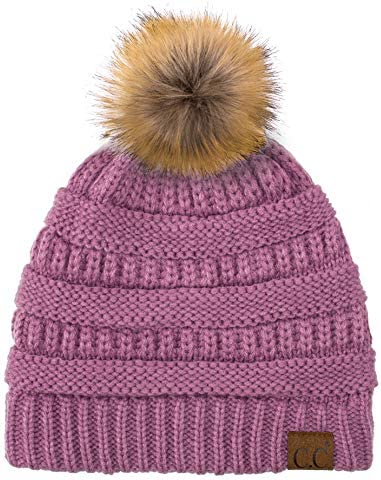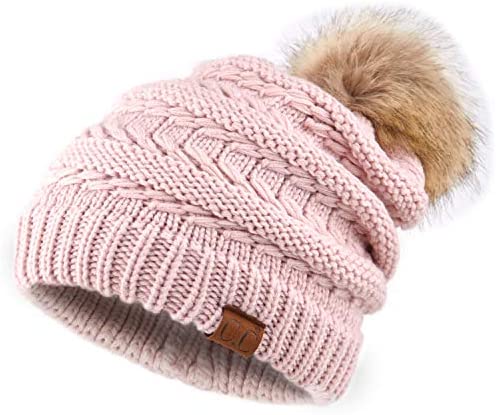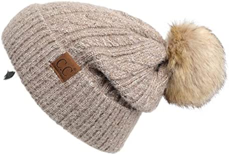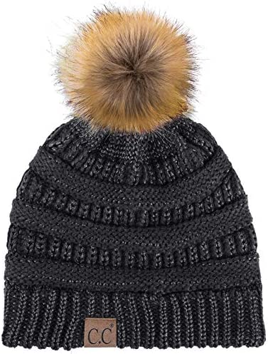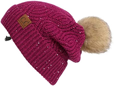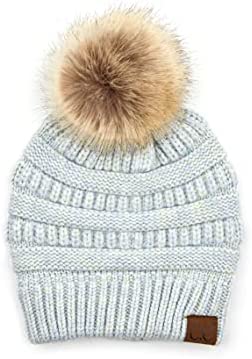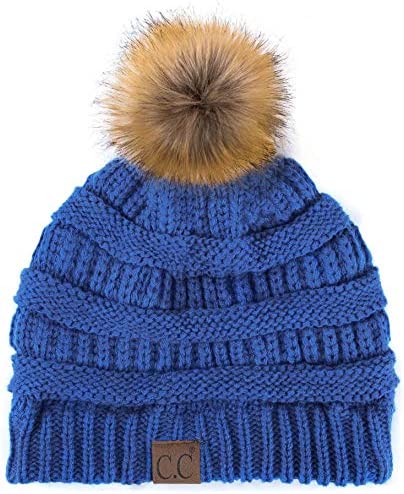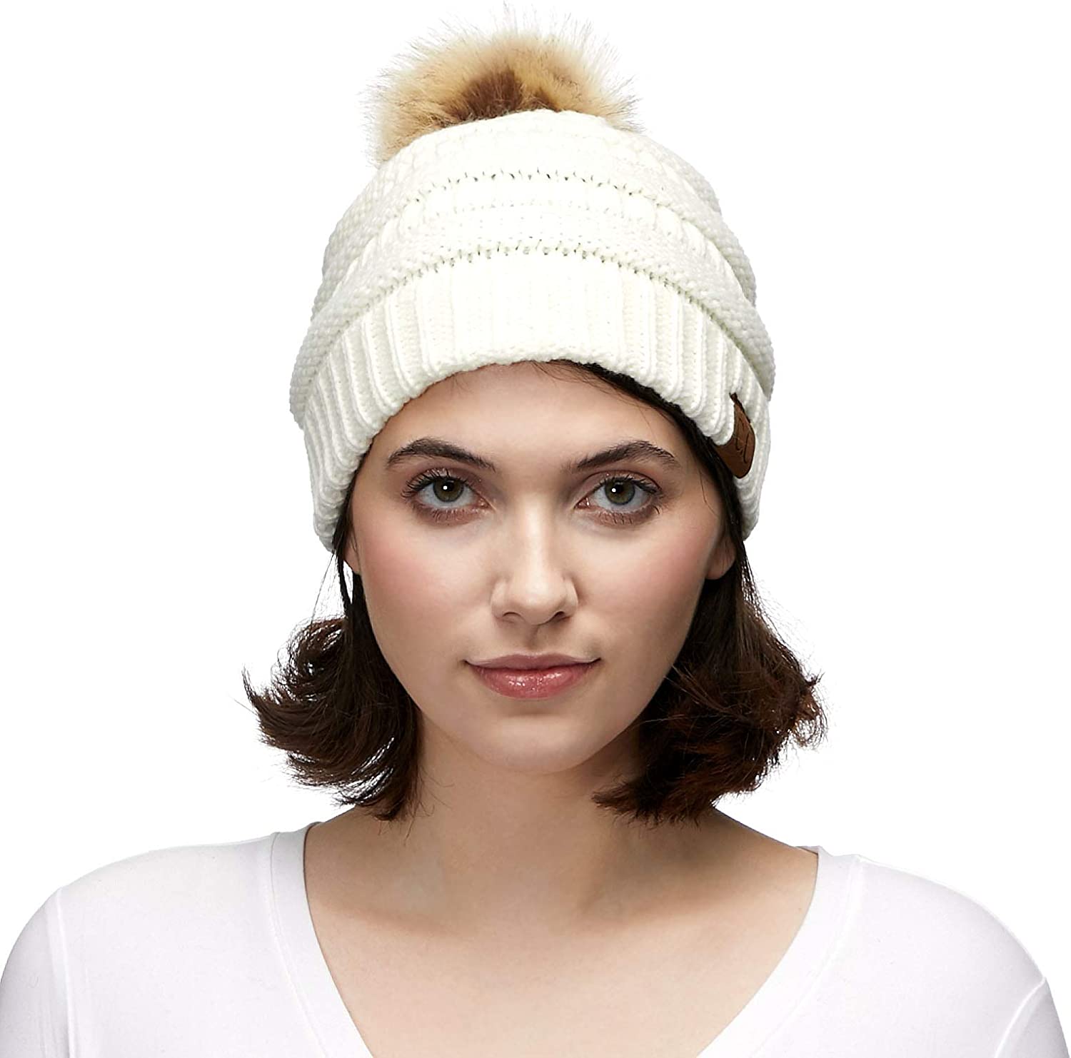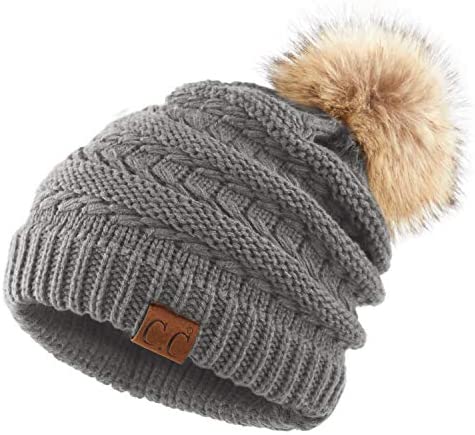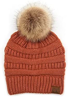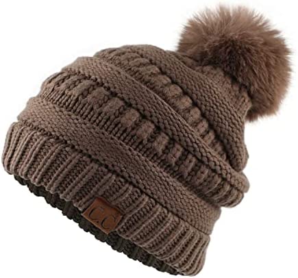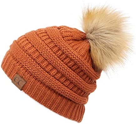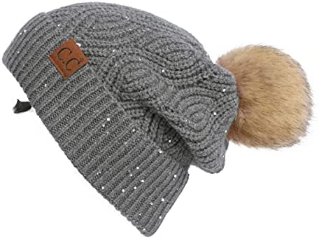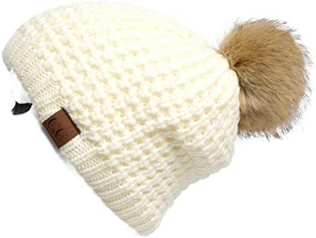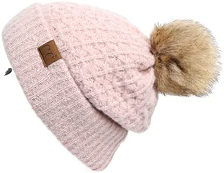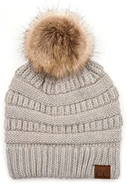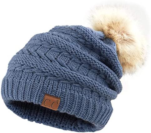 C.C Thick Cable Knit Faux Fuzzy Fur Pom Fleece Lined Skull Cap Cuff Beanie
