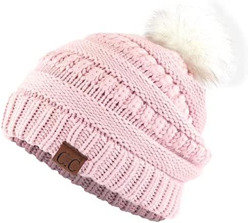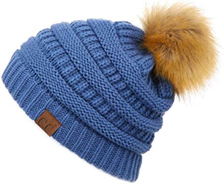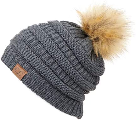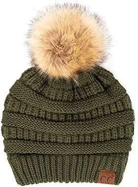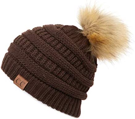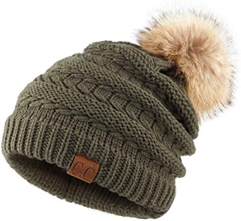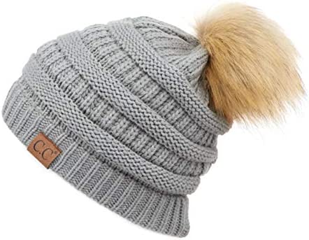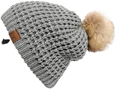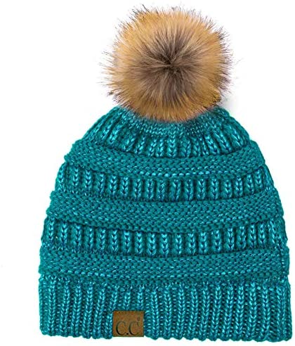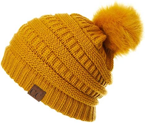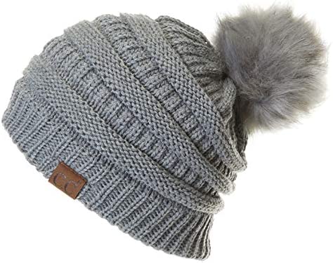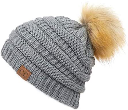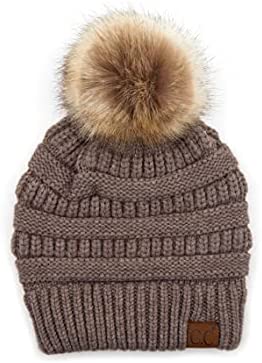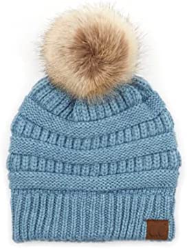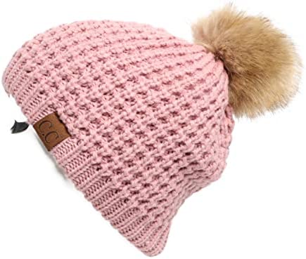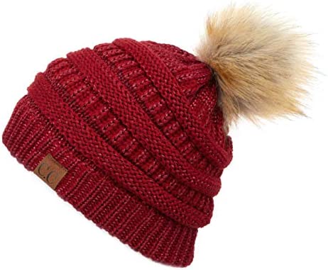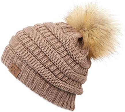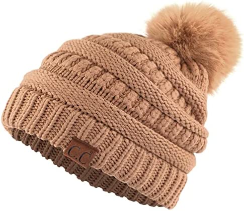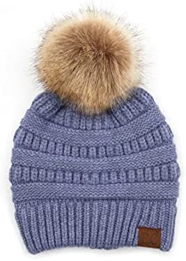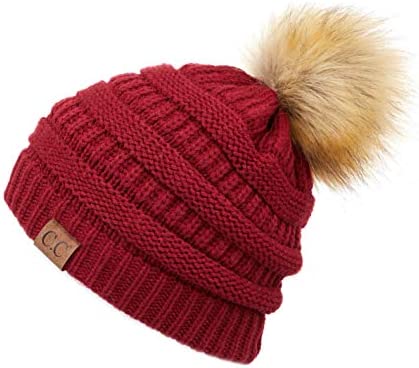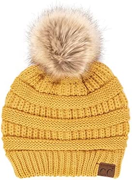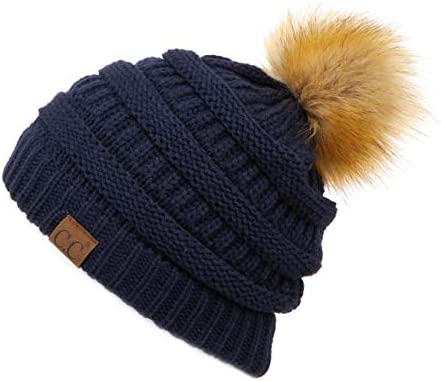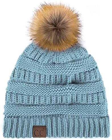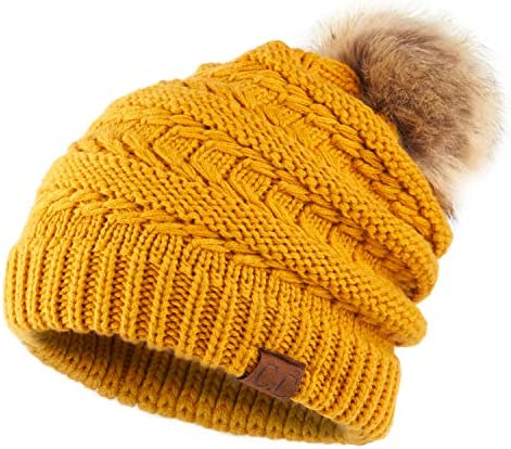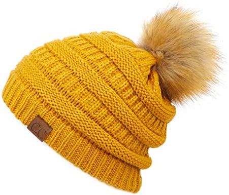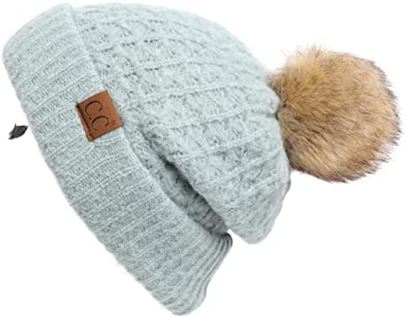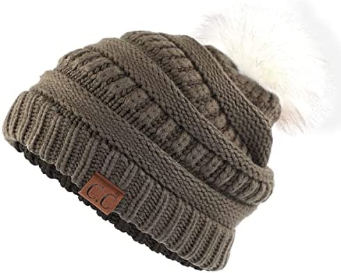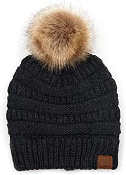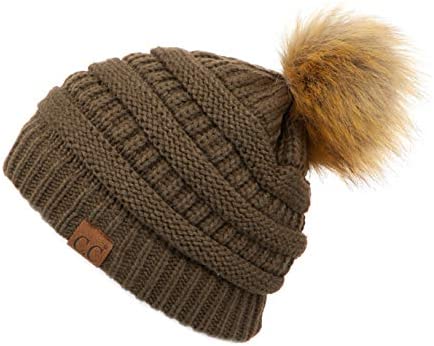 C.C Thick Cable Knit Faux Fuzzy Fur Pom Fleece Lined Skull Cap Cuff Beanie