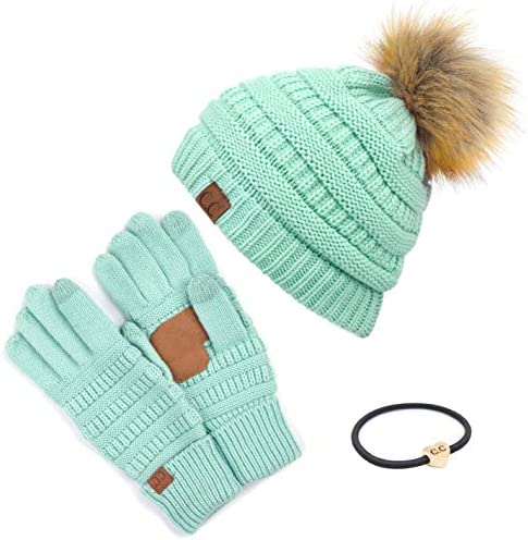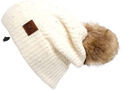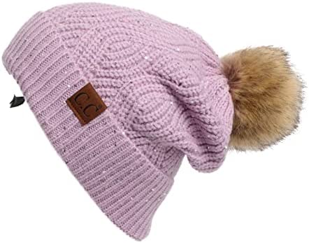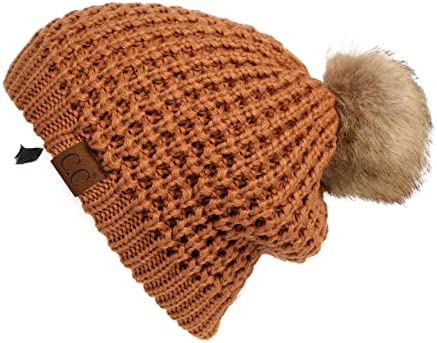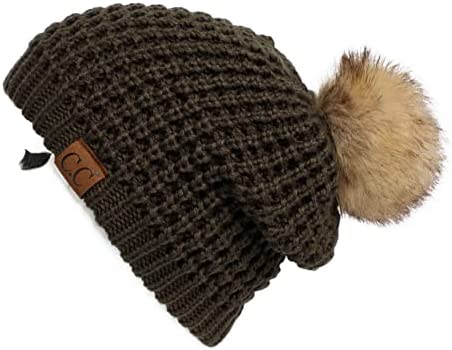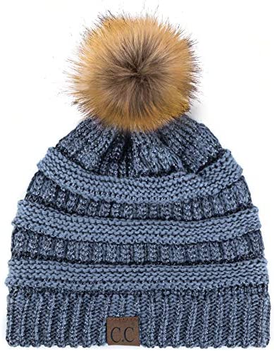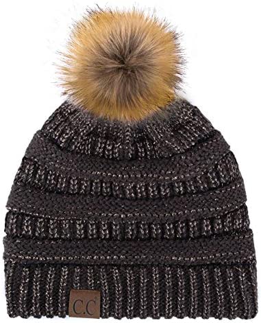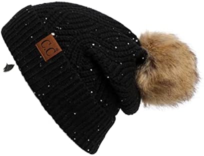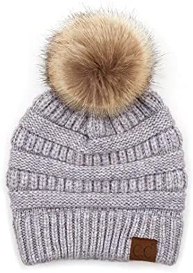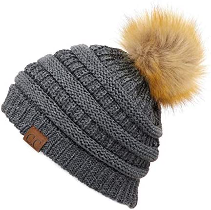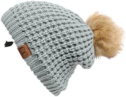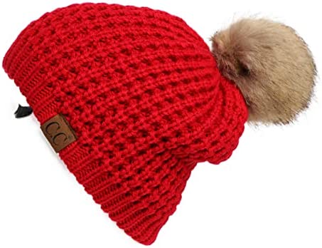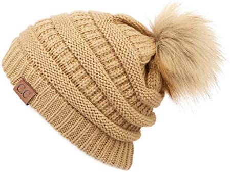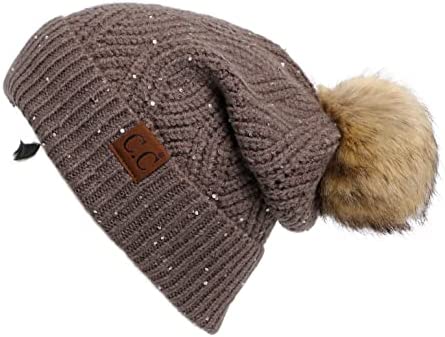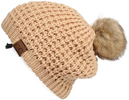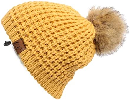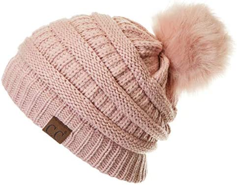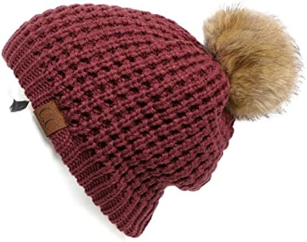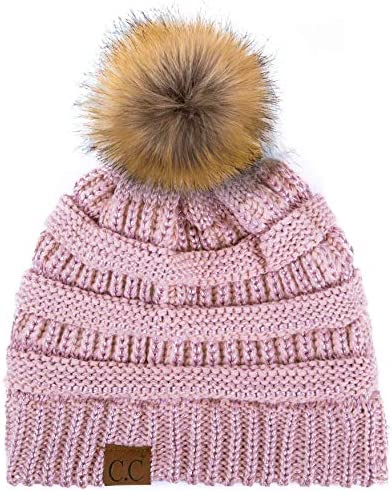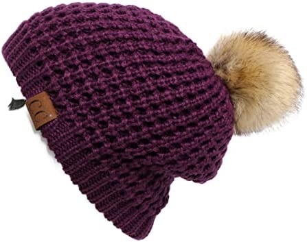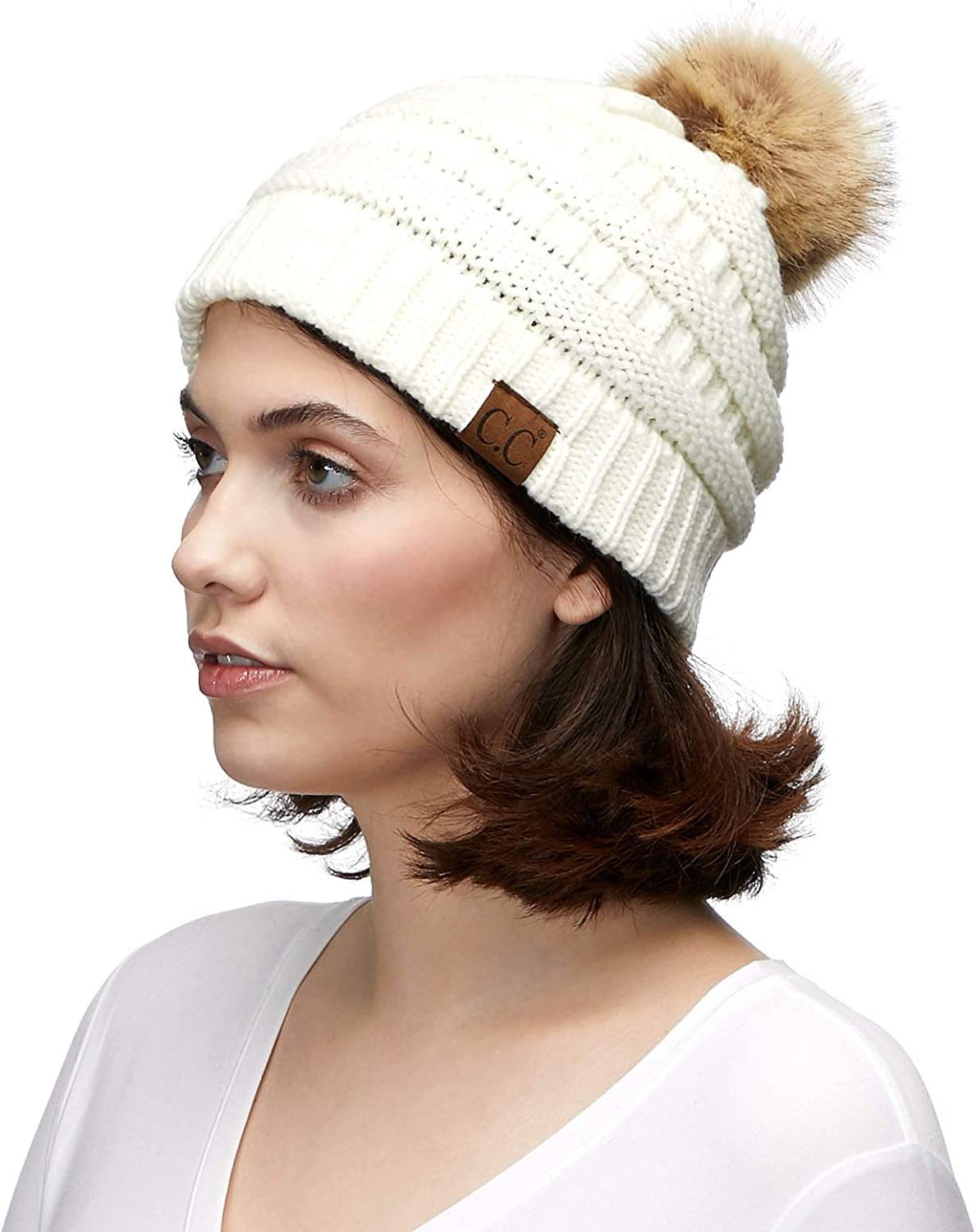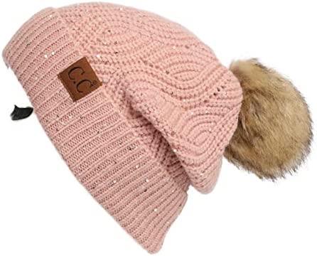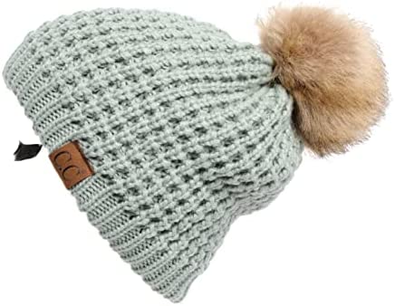 C.C Thick Cable Knit Faux Fuzzy Fur Pom Fleece Lined Skull Cap Cuff Beanie