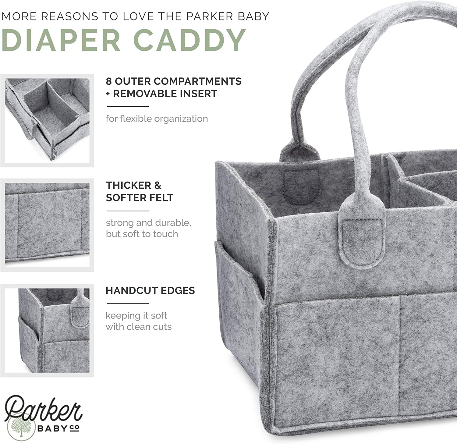 • ESSENTIAL STORAGE BASKET FOR NEWBORN PRODUCTS - The Parker Baby Diaper Caddy (patented) is versatile enough for all that baby stuff: baby toys, diapers, baby clothes, baby wipes, bibs, onesies, baby toys, cloth diapers, changing pads, medicine, burp cloths and other baby essentials! Large enough for dozens of diapers and most wipes dispensers.