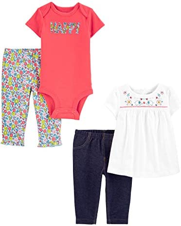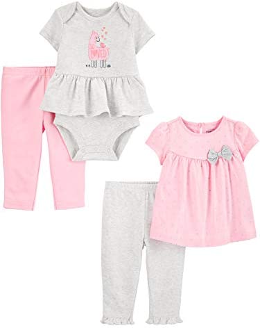 Featuring ruffles, floral prints, and cute critters, this 4-piece mix-and-match set includes two body suits and two pants.