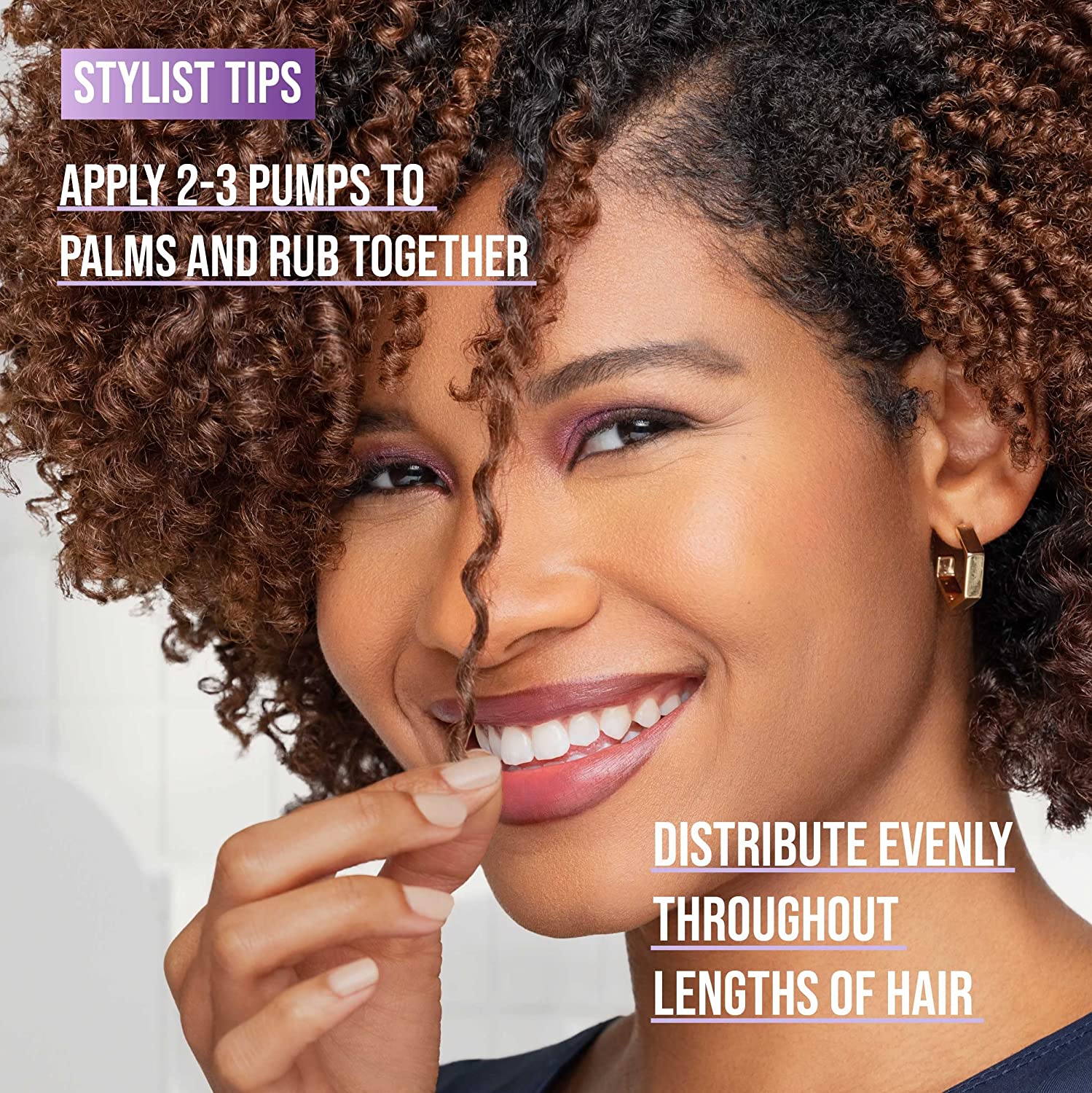 STYLIST TIP: Apply 2-3 pumps to palms and rub together, then distribute evenly throughout lengths of hair