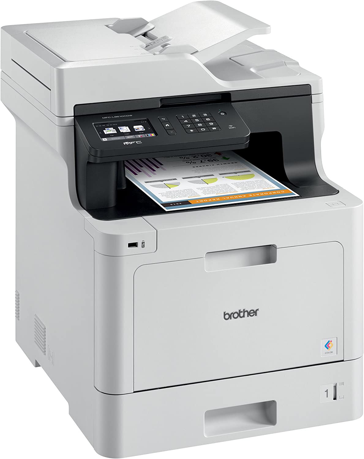 The Brother MFC-L8610CDW Color Laser All-in-One is a great choice for offices and small workgroups that need cost-efficient printing, easy scanning, secure document handling, and reliable, business-quality output. This color laser printer, copier, scanner, and fax machine was designed to enhance office productivity by delivering print speeds up to 33ppm(1) and scan speeds up to 29ipm. (6) The built-in scanning feature allows users to scan to popular destinations including e-mail, SharePoint, and business cloud services. (4) Connecting to the Brother MFC-L8610CDW is simple and convenient. Built-in wireless and Gigabit Ethernet network interfaces allow users to share the all-in-one. Plus, users can wirelessly print from a wide variety of mobile devices over a wireless network. An adjustable 3. 7″ Touchscreen display offers easy menu navigation and printing from and scanning to popular business Cloud services such as Google Drive, Dropbox, OneDrive, and more. (2) This Brother all-in-one offers a 50-page capacity automatic document feeder for copying, scanning and faxing multi-page documents. The adjustable 250-sheet capacity paper tray and 50-sheet capacity multipurpose tray make printing and copying simple. This office all-in-one can be upgraded to a 1, 050-sheet total capacity with optional trays. The MFC-L8610CDW is also Dash Replenishment enabled. This system allows the all-in-one to measure the toner level of your Genuine Brother Replacement Cartridges and automatically order replacements. This ensures you never run out of toner so that you can maintain the office efficiency you expect and require. (1)Based on one-sided printing. Change from default setting required. (2)Requires an Internet connection and an account with desired service. (3)Approximate cartridge yield in accordance with ISO/IEC 19798 (letter/A4). (4)Requires connection to a wireless network. (5)The mobile device must have NFC capability and run Android OS 4. 4 or later. (6)Scan speed measured with all advanced features turned off using LTR size test documents at 200dpi.