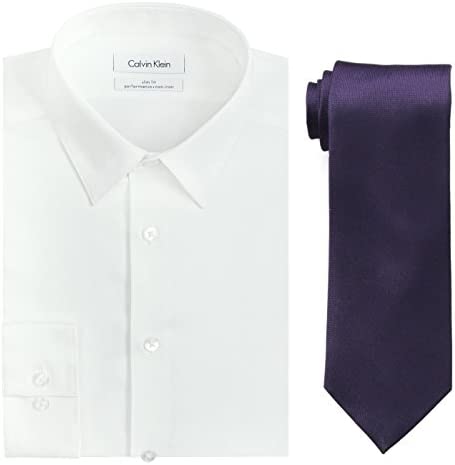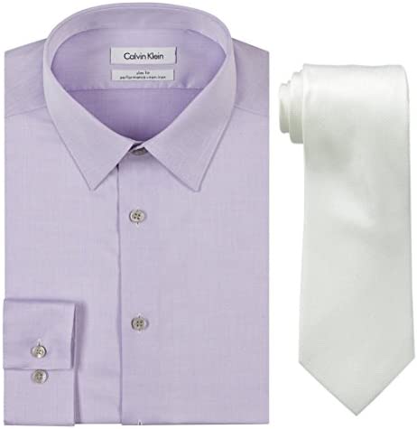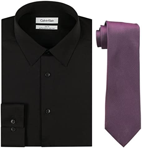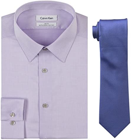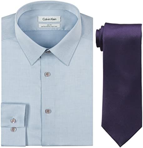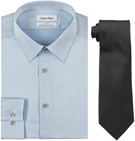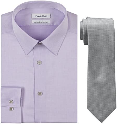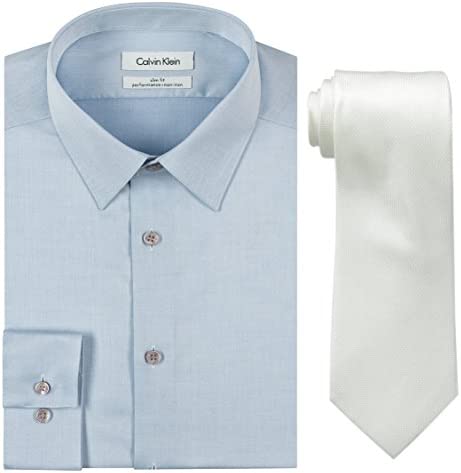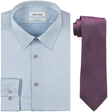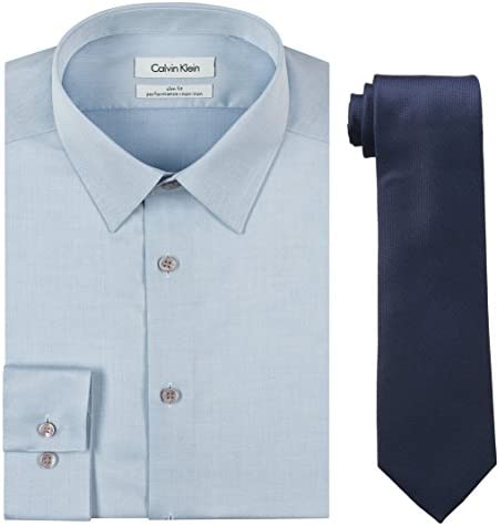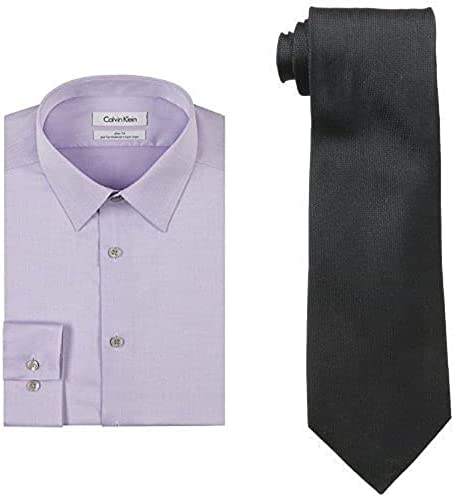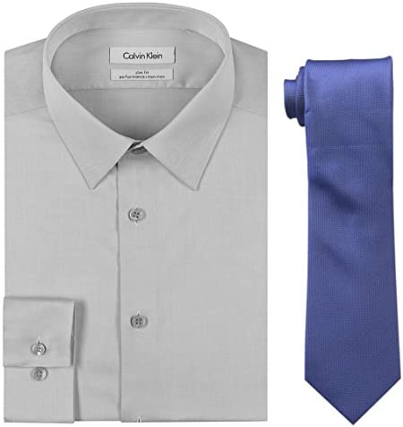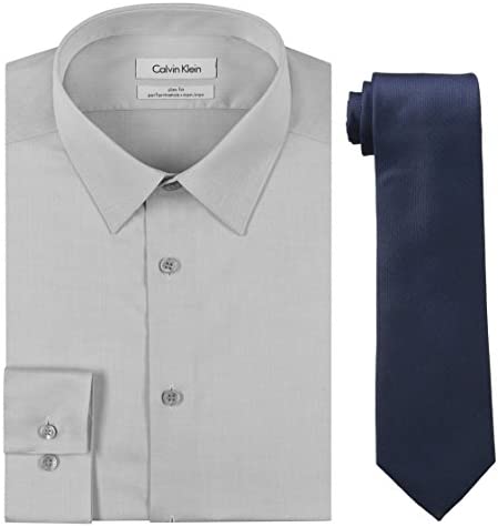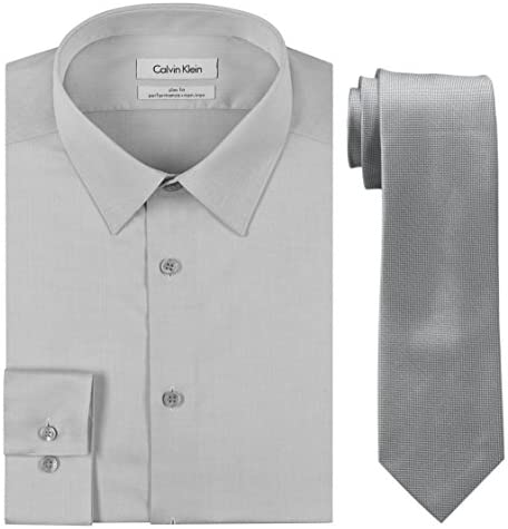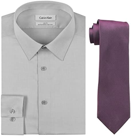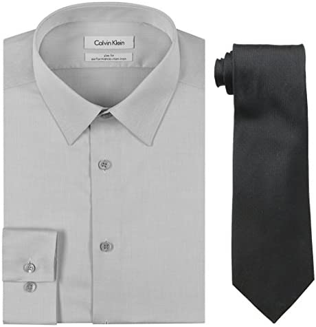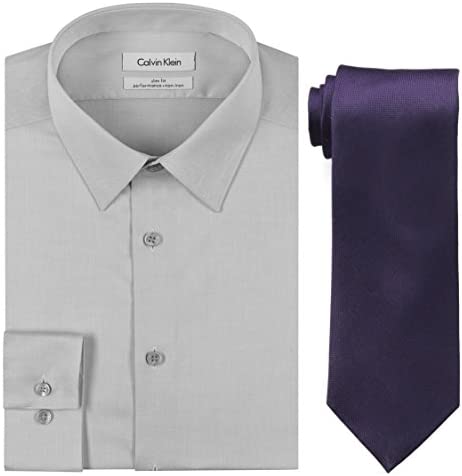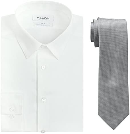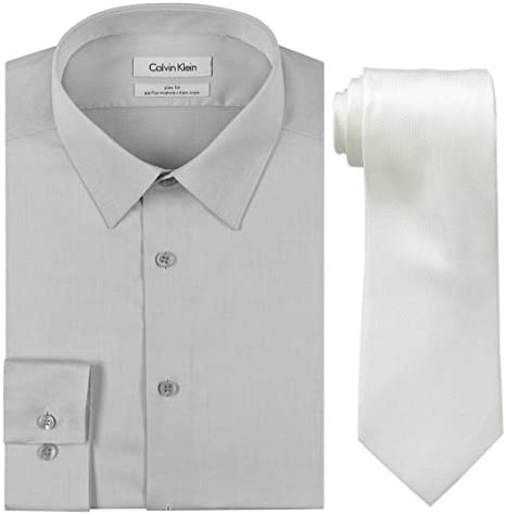 Calvin Klein Men's Slim Fit Herringbone Dress Shirt and Silver Spun Tie Combo