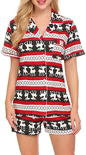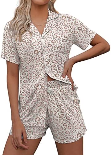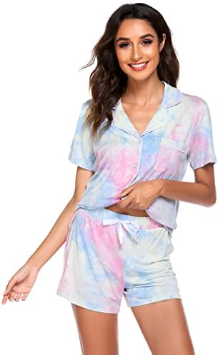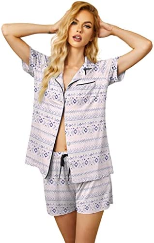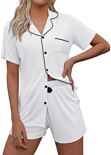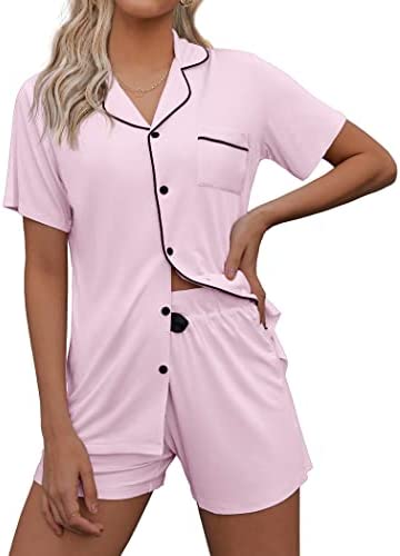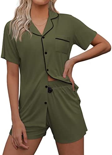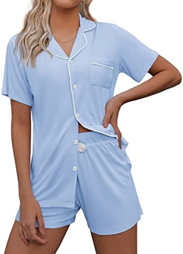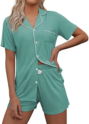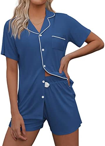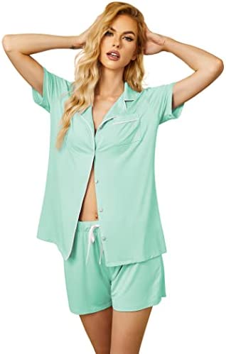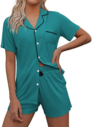 Ekouaer Women's Two-Piece Sleepwear Short Sleeve Pajama Set Pj Shorts XS-XLPajama set for women made from 95% Polyester/5% Spandex.Ultra soft and cozy Ekouaer sleepwear.Two piece pajamas set featuring short sleeve top and pj shorts for relaxed fit.This classic sleepwear with superior stitching and perfectly-lined hems. Breathable and Comfy sleepwear set.Ekouaer Pajamas Set Short Sleeve Sleepwear Womens Button Down Nightwear Soft Pj Lounge Sets XS-XXLPajam Top: Short sleeve sleepwear with button down pajama shirt hits at hip ,chest pocket with notch collar.Great for sleeping,casual wear or lounging around the house or yard all dayPajama Bottom: Pj lounge shorts with chiffon drawstring elastic waist.Summer pajama set is perfect for sleepwear,night wear or loungewear.This soft pajamas for women is the best sleepwear.Multiple colors pjs for women that suitable for the needs and preferences of different occasions.Two piece pajama set are perfect for pajama parties,bridal,dorm rooms,fun family pajamas pictures.And this short sleep set with high quality is also great for as a birthday,Valentine's Day,Christmas,New Year,Wedding and any other holiday gift set for your mom,wife,daughter and friendsEkouaer Sleepwear Short Sleeve Soft Cozy Pajama Set Silk Sleeping WearEco-friendly fabric:Body: 95% Polyester/5% Spandex.Easy fit and lightweightTwo-piece sleep pajama set featuring short sleeve top and boxer shortsTop: button-down with notch collar ,chest pocket with Ekouaer logo embroidery,and chiffon trimBottom: Short pants featured Elastic waist with chiffon drawstringMachine washable. To prevent wrinkles, promptly remove from dryerOur size are standard US size,please just choose your normal sleepwear size.