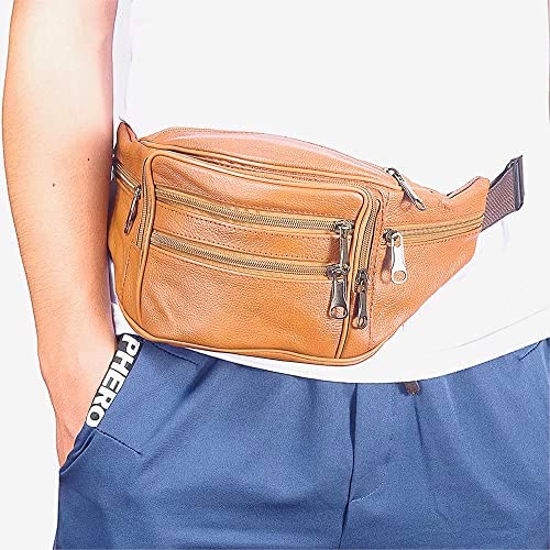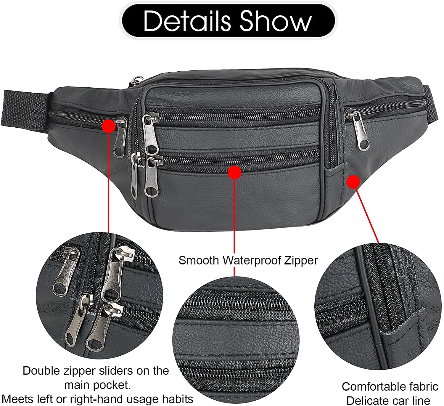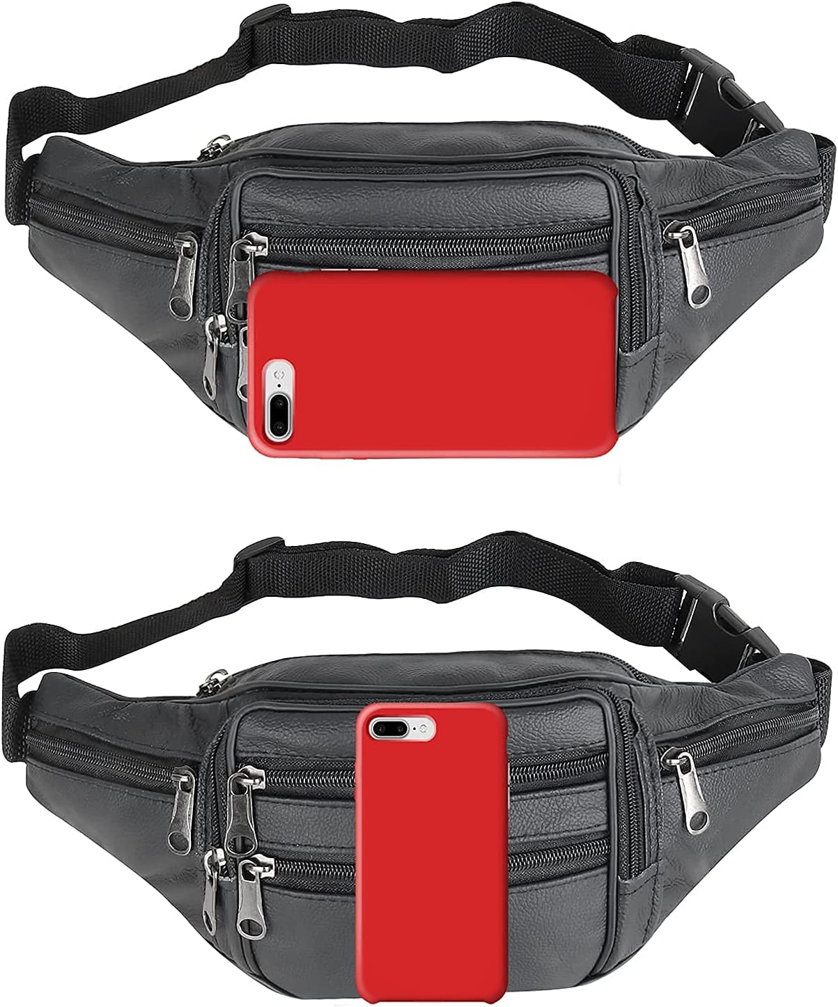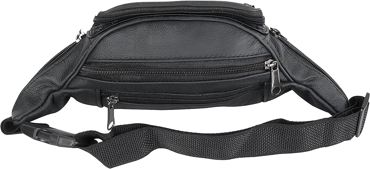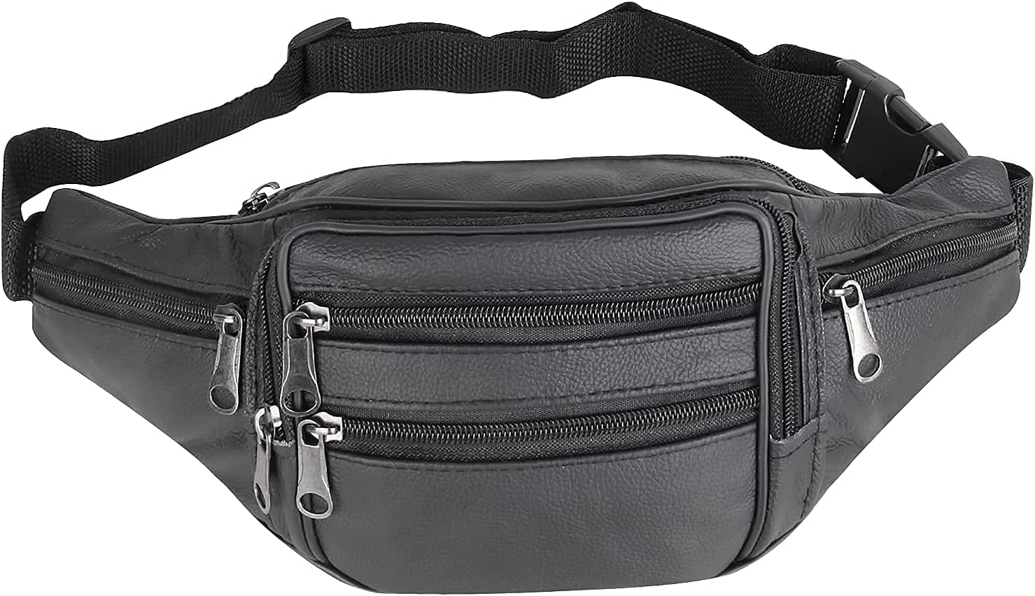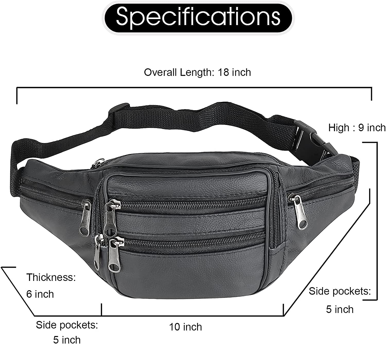 • The leather Fanny pack has an Adjustable strap up to 47" waist