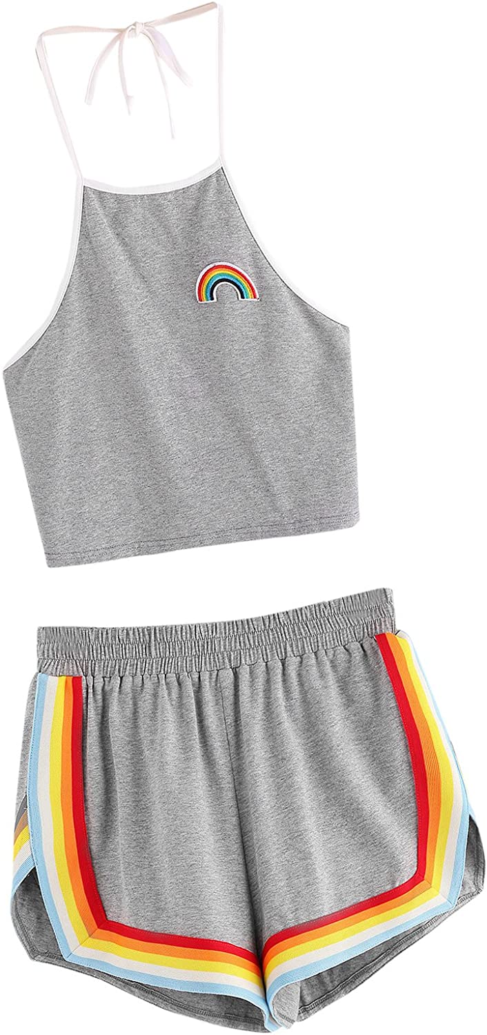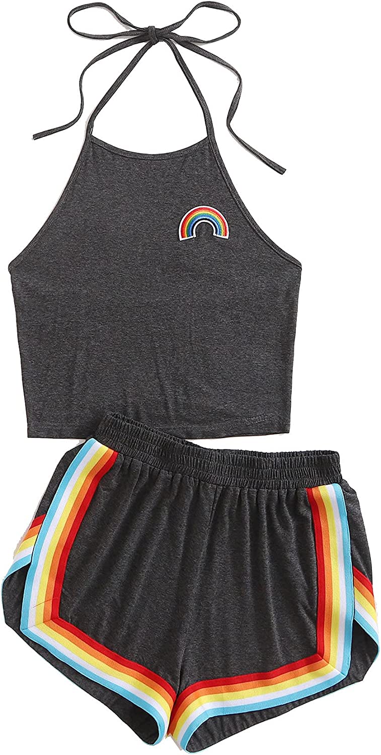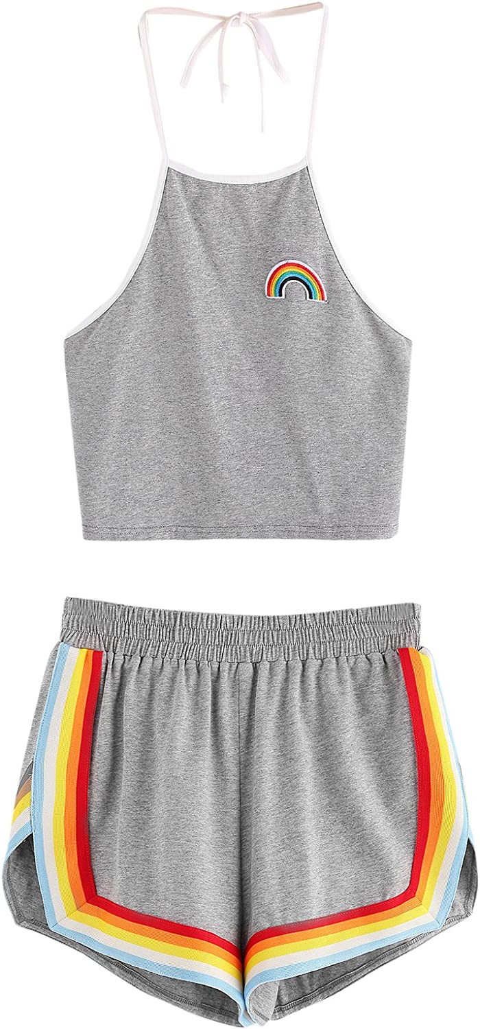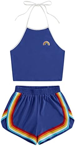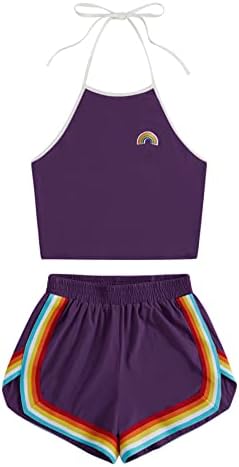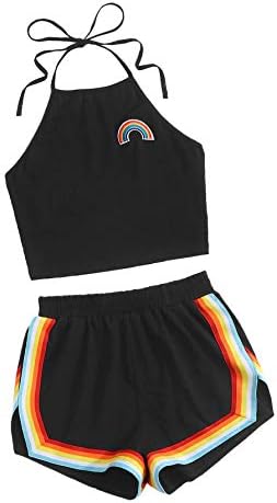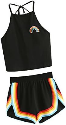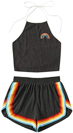 Sleeveless,high neck, halter, straps, rainbow patch crop top and rainbow trimming, elastic waist dolphin short