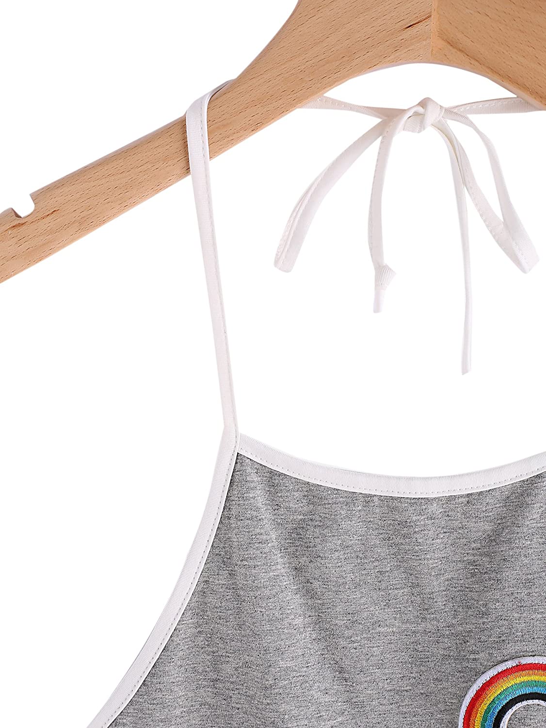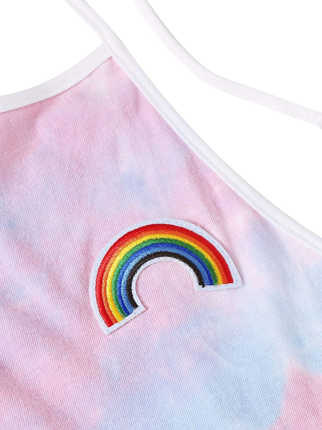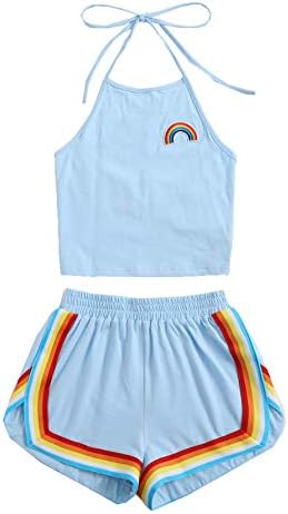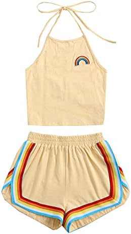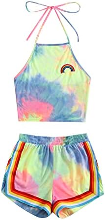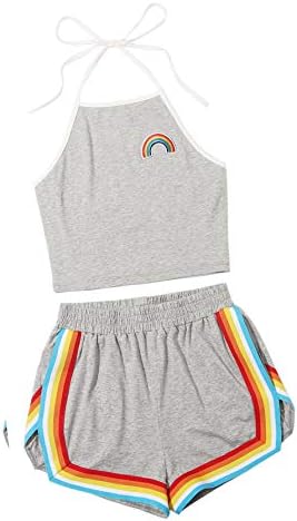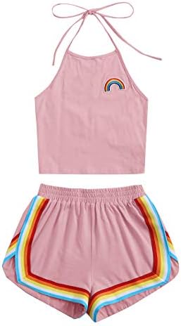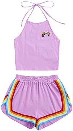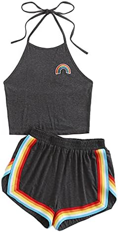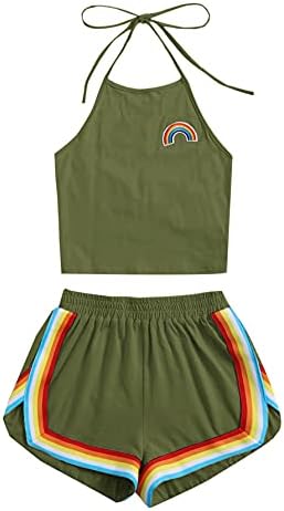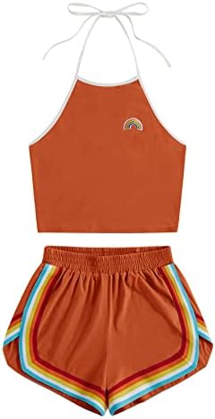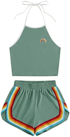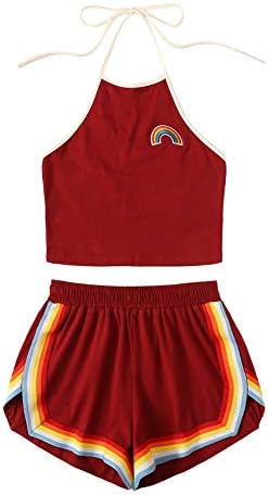 Sleeveless,high neck, halter, straps, rainbow patch crop top and rainbow trimming, elastic waist dolphin short